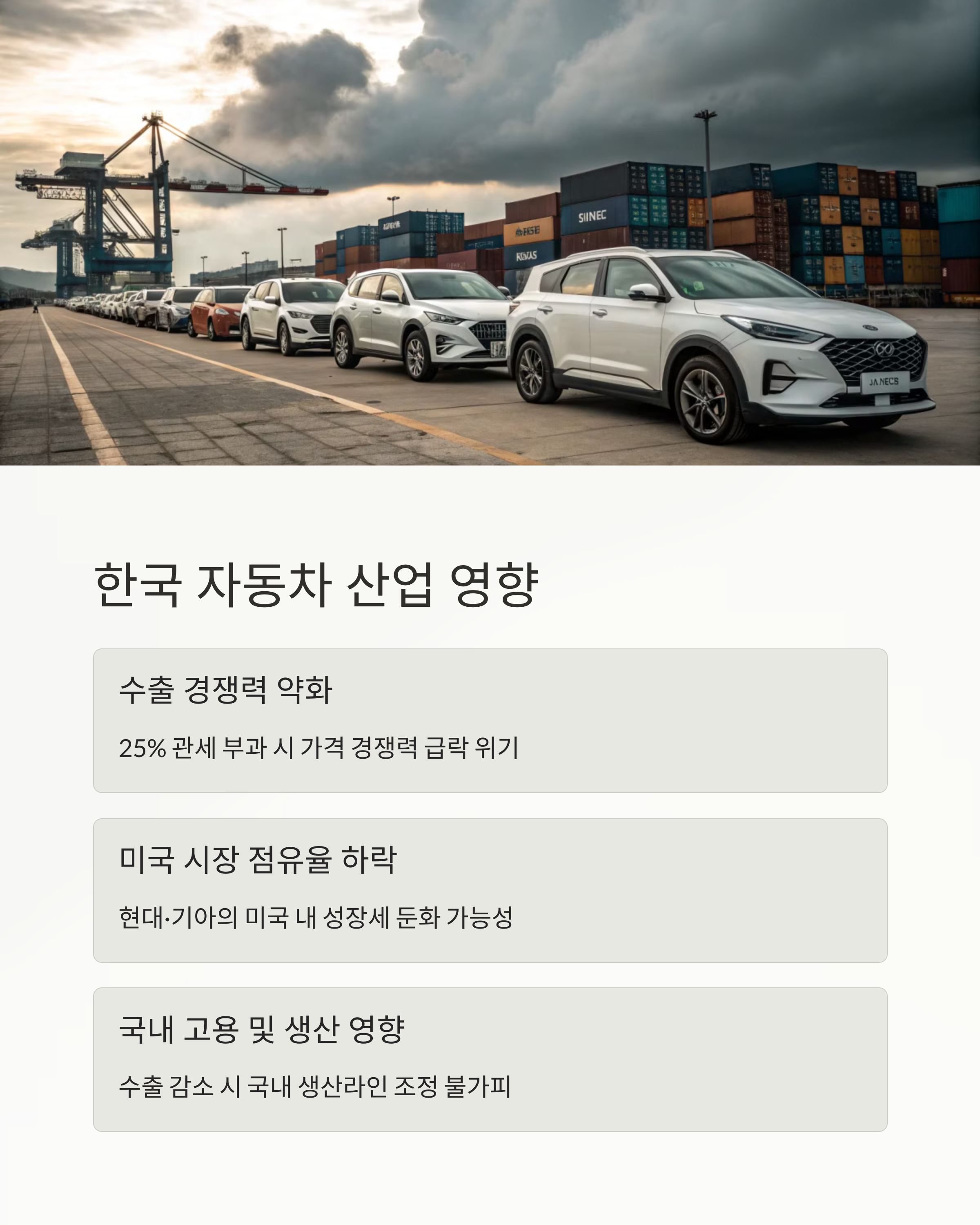 - 미국 수출 의존도 높은 모델들 (투싼, 싼타페 등) 판매 위축 우려