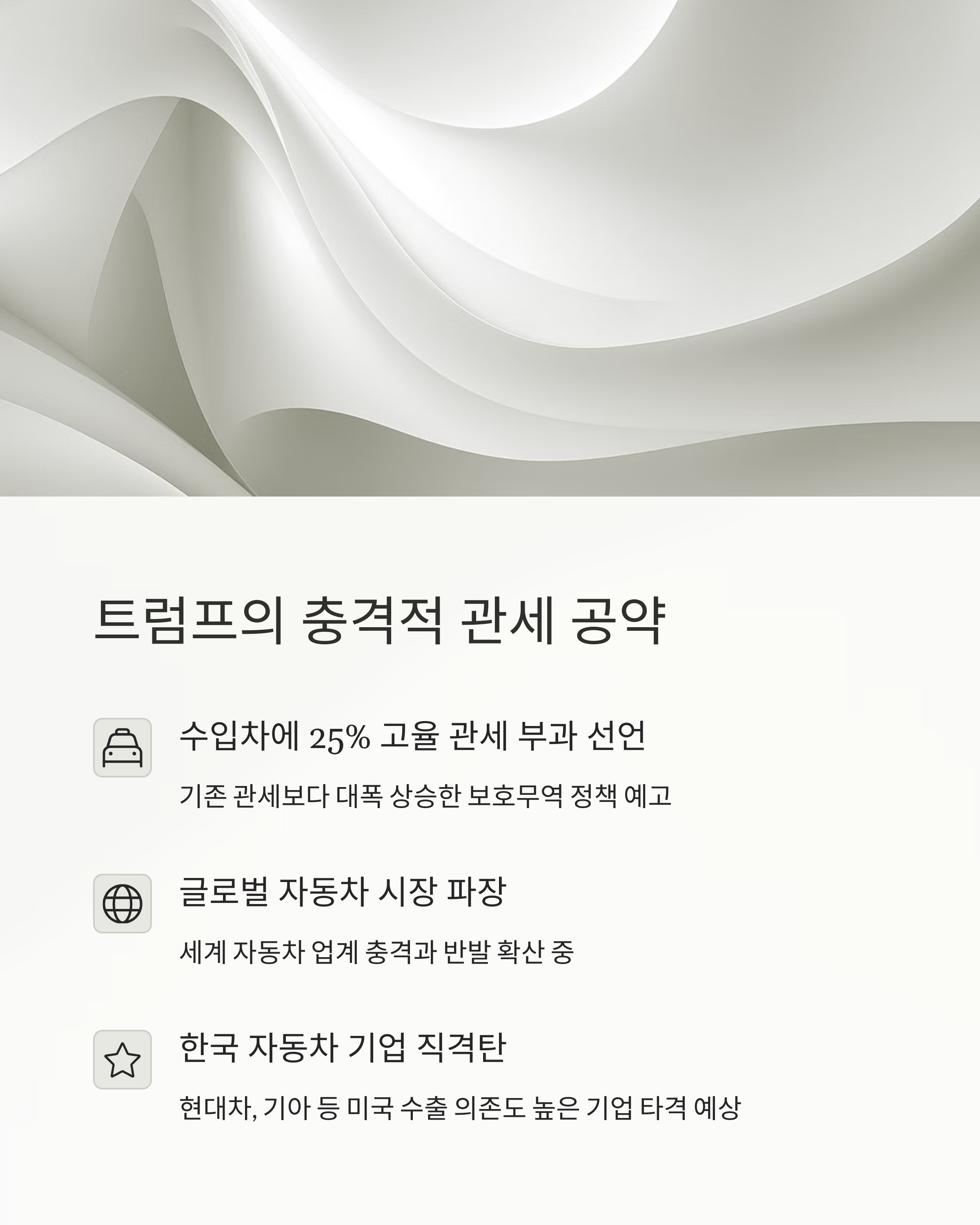 - 실제 관세 부과 → 글로벌 자동차 산업 단기 침체 가능성