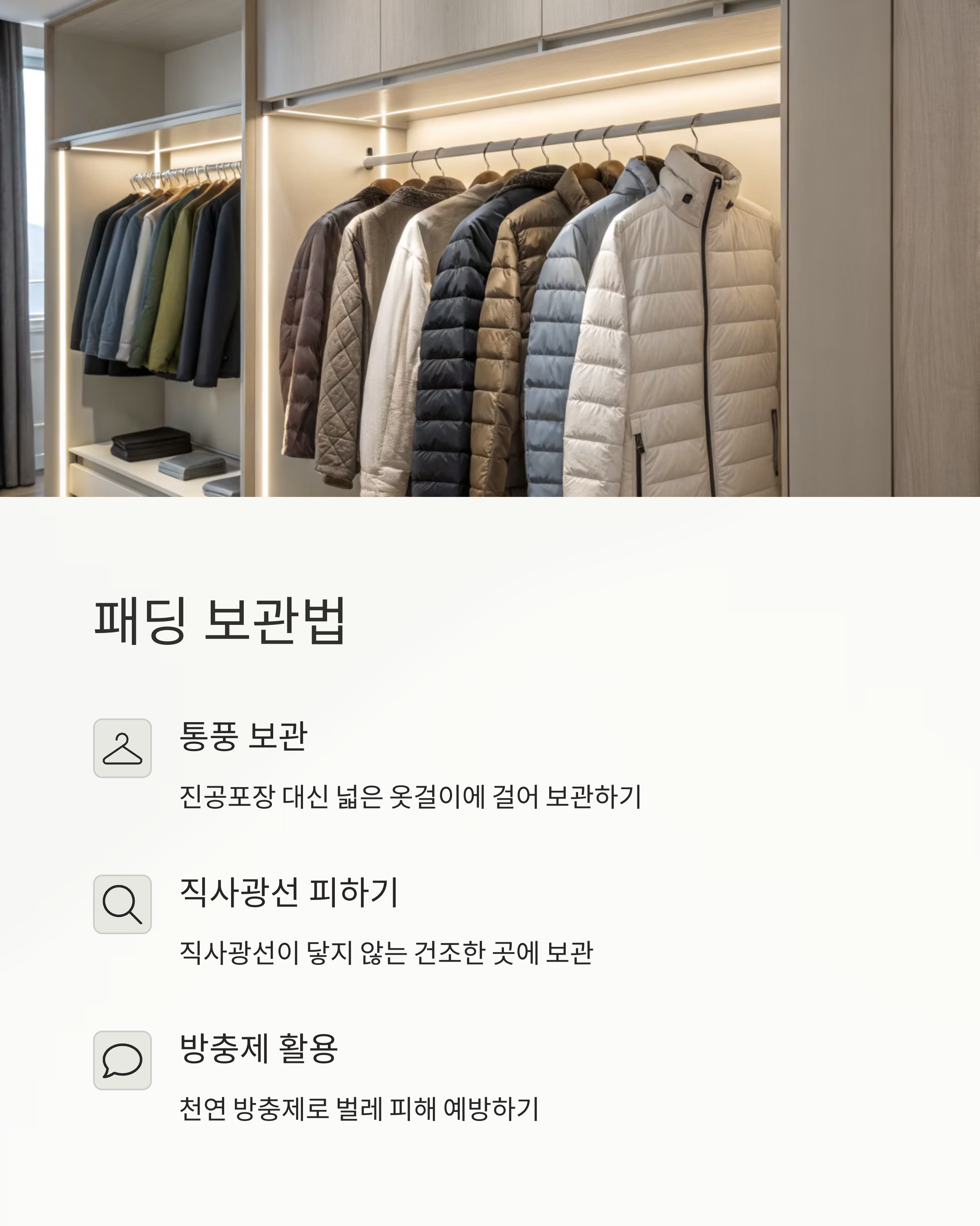 패딩을 세탁까지 완벽히 했는데, 보관을 잘못하면 말짱 도루묵! 절대 진공팩에 꽉 눌러 넣지 마세요. 패딩은 ‘부피’가 생명이거든요. 통풍 잘 되는 옷커버에 걸어서 보관하거나, 헐렁한 큰 수납함에 넣는 게 가장 좋아요. 안쪽에 제습제 하나 넣어주면 곰팡이 걱정도 뚝!