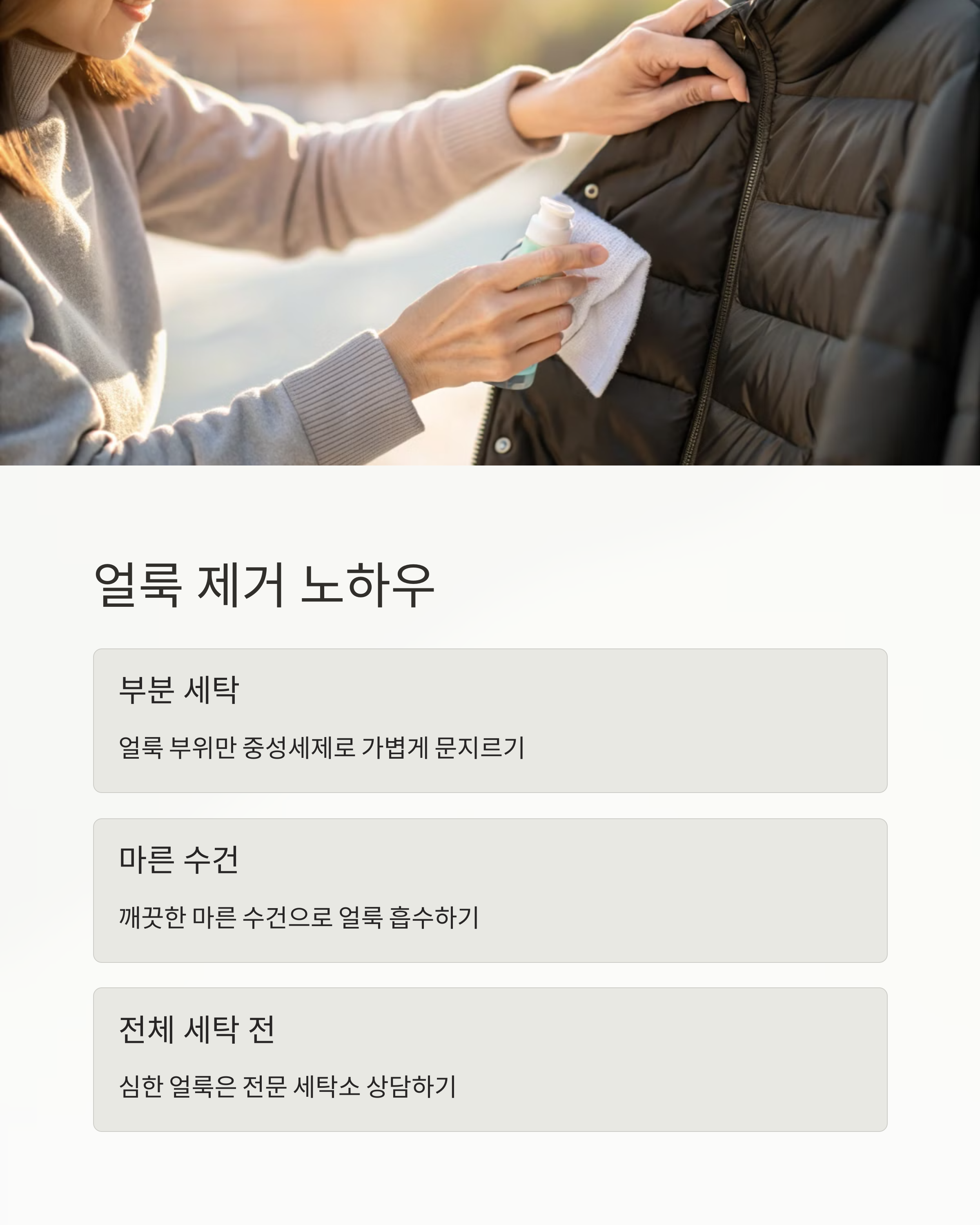 패딩에 묻은 기름때나 음식 얼룩, 손목 때 자국 등은 전체 세탁보다 ‘부분 세탁’이 훨씬 효율적이에요. 중성세제 또는 주방세제 소량을 물에 희석한 뒤, 면봉이나 부드러운 천으로 톡톡 두드리며 닦아주세요. 문지르면 방수 코팅이 벗겨질 수 있으니 꼭 ‘두드리는’ 방식으로!