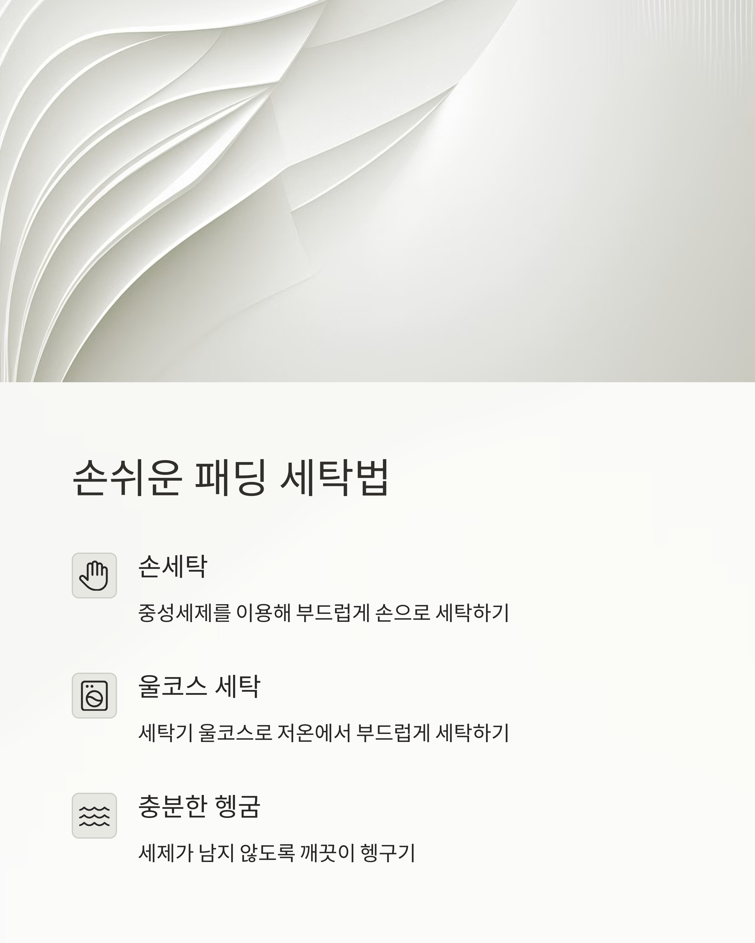 패딩은 브랜드마다 충전재(오리털, 거위털, 솜)나 겉감 종류가 다르기 때문에, 무작정 물에 넣기 전에 반드시 세탁 라벨을 확인해야 해요. ‘드라이클리닝 전용’이라고 쓰여 있다면 웬만하면 손세탁도 피해야 하고요, ‘찬물 손세탁 가능’이라고 되어 있다면 비교적 안전하게 셀프로 할 수 있답니다. 라벨에 세탁기 표시가 있다면 꼭 ‘울코스’나 ‘약하게’를 선택해 주세요.
