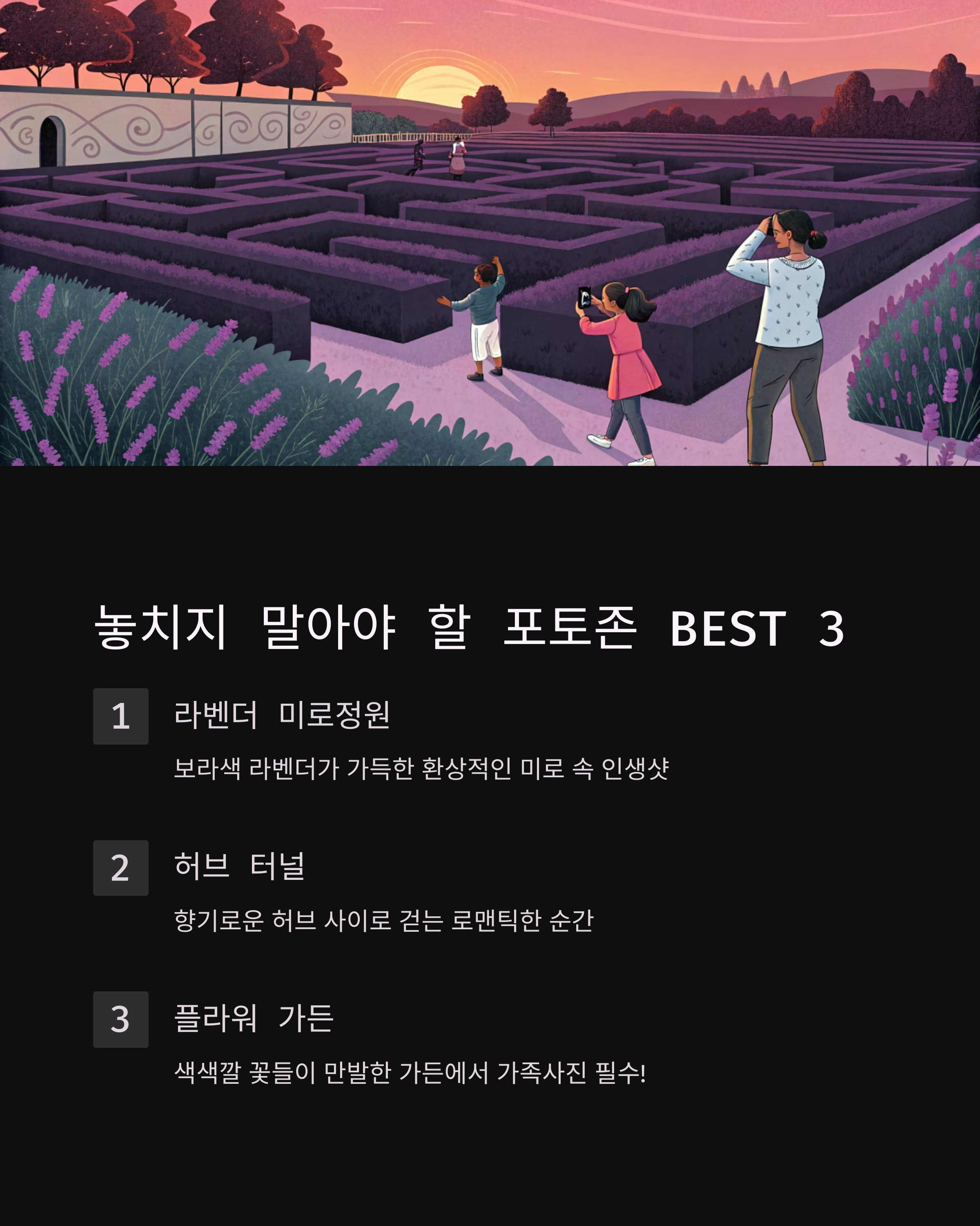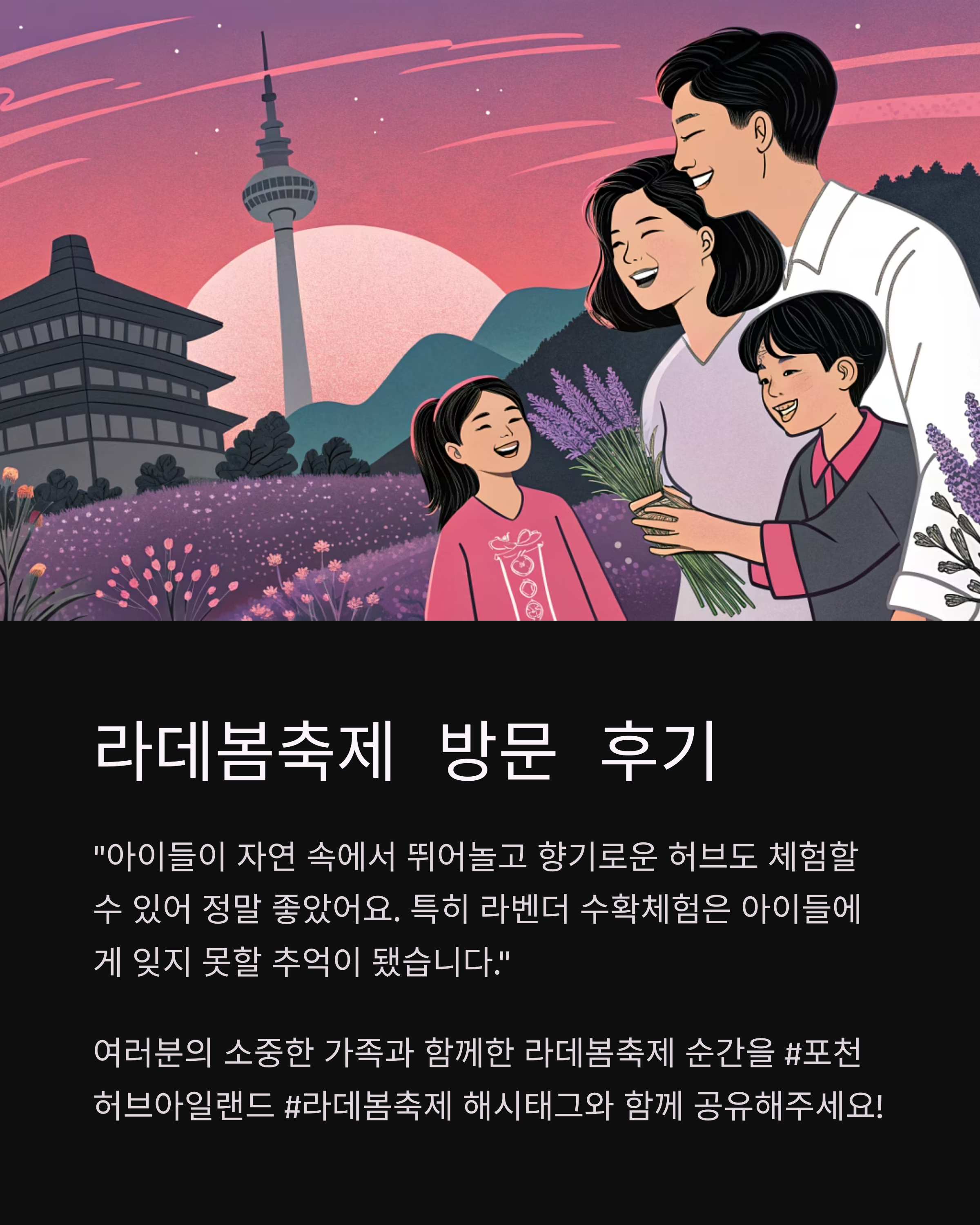 아이와 특별한 봄날을 보내고 싶다면, 포천 허브아일랜드에서 열리는 라데봄축제를 강력히 추천합니다. 자연 속에서 허브향을 맡으며 동화 같은 조명 아래 아이와 함께 웃고 즐기는 하루는, 오랜 시간 추억으로 남을 거예요. 저도 다녀오고 나니 “다음엔 부모님도 함께 오면 좋겠다”는 생각이 들었답니다. 다음 포스팅에서는 ‘서울 근교 1박 2일 가족 여행지’도 소개할 예정이니 기대해주세요!