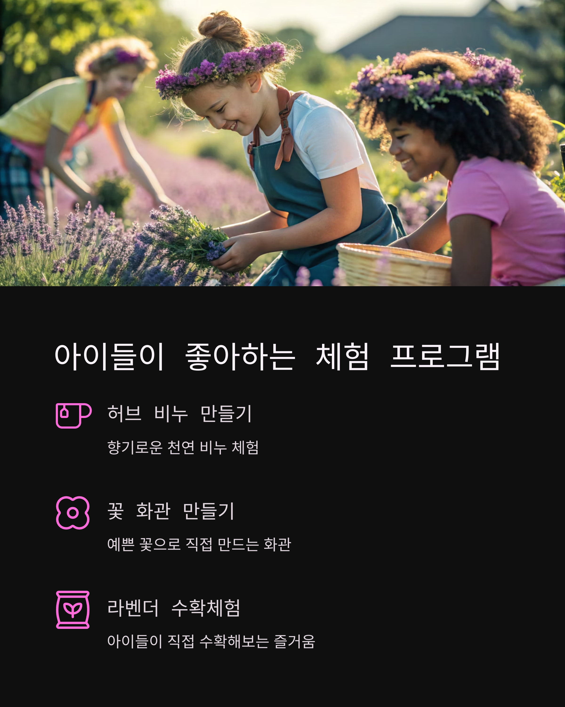 | 체험 프로그램 | 허브 쿠킹, 롤온 만들기, 미니기차 등 어린이 전용 콘텐츠 |
