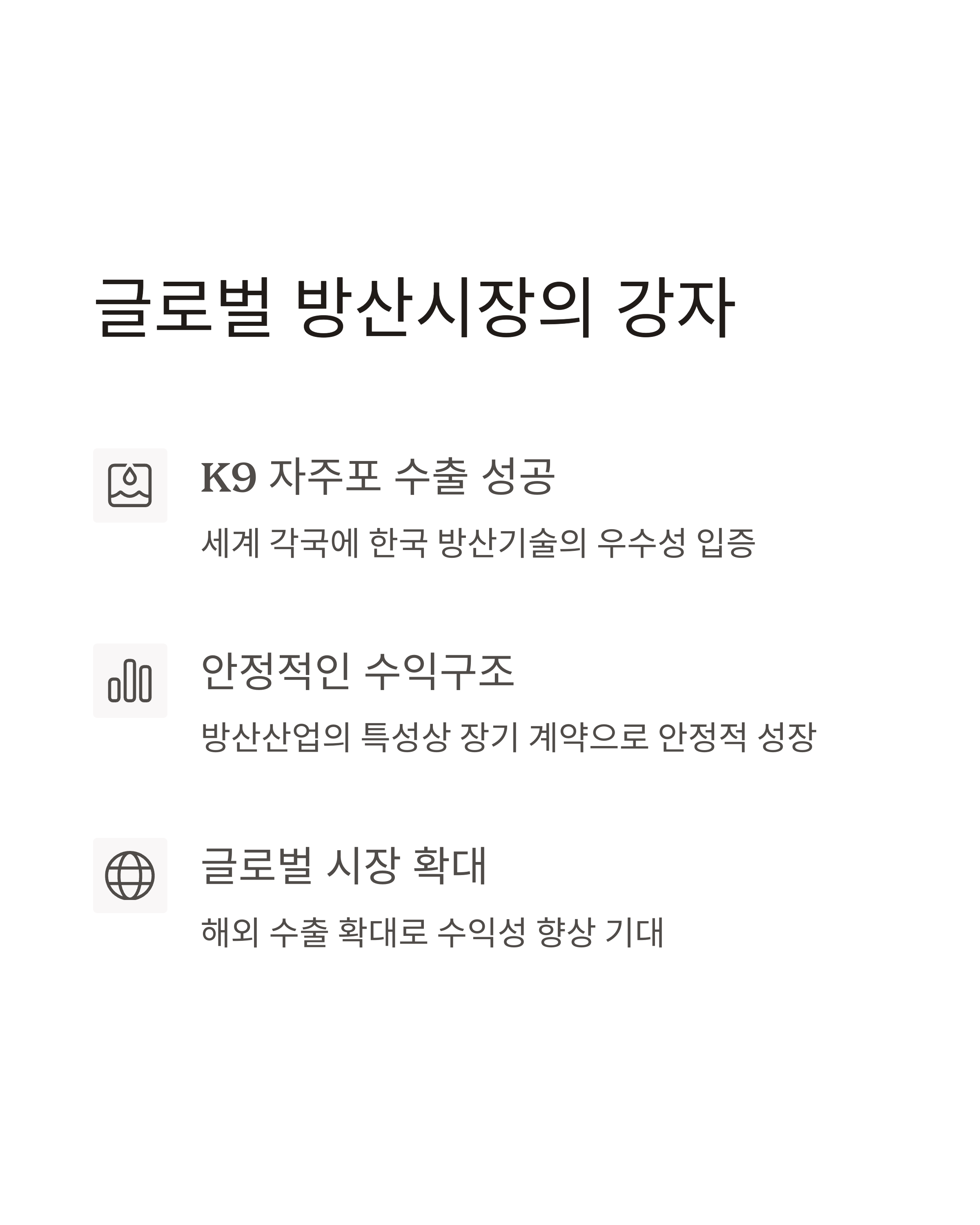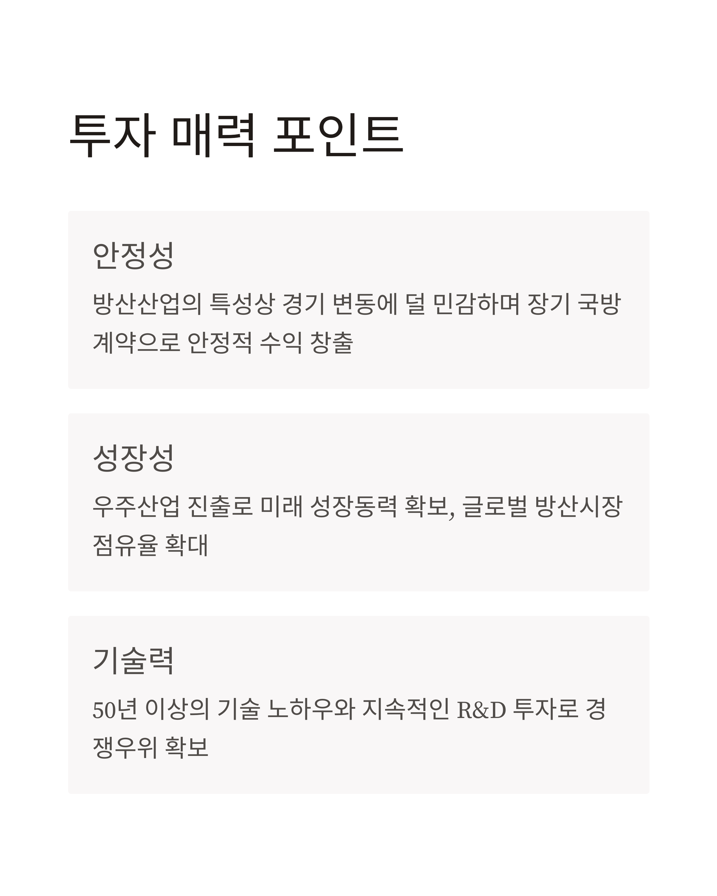 - 방산 분야 특성상 경기 영향을 덜 받음 (디펜시브 섹터)