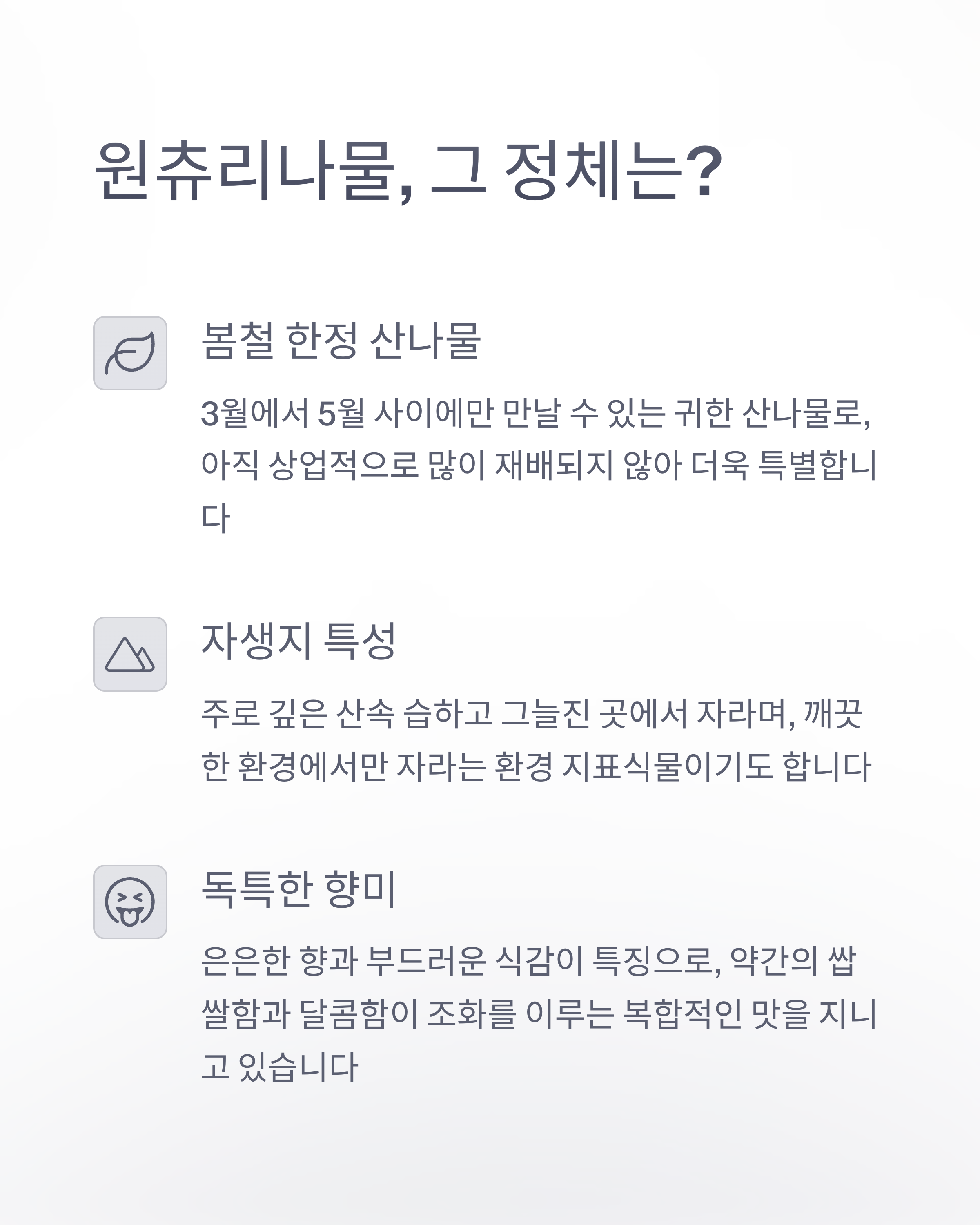 | 원츄리나물 | 향긋하고 은은한 단맛 | 연하고 부드러움 |