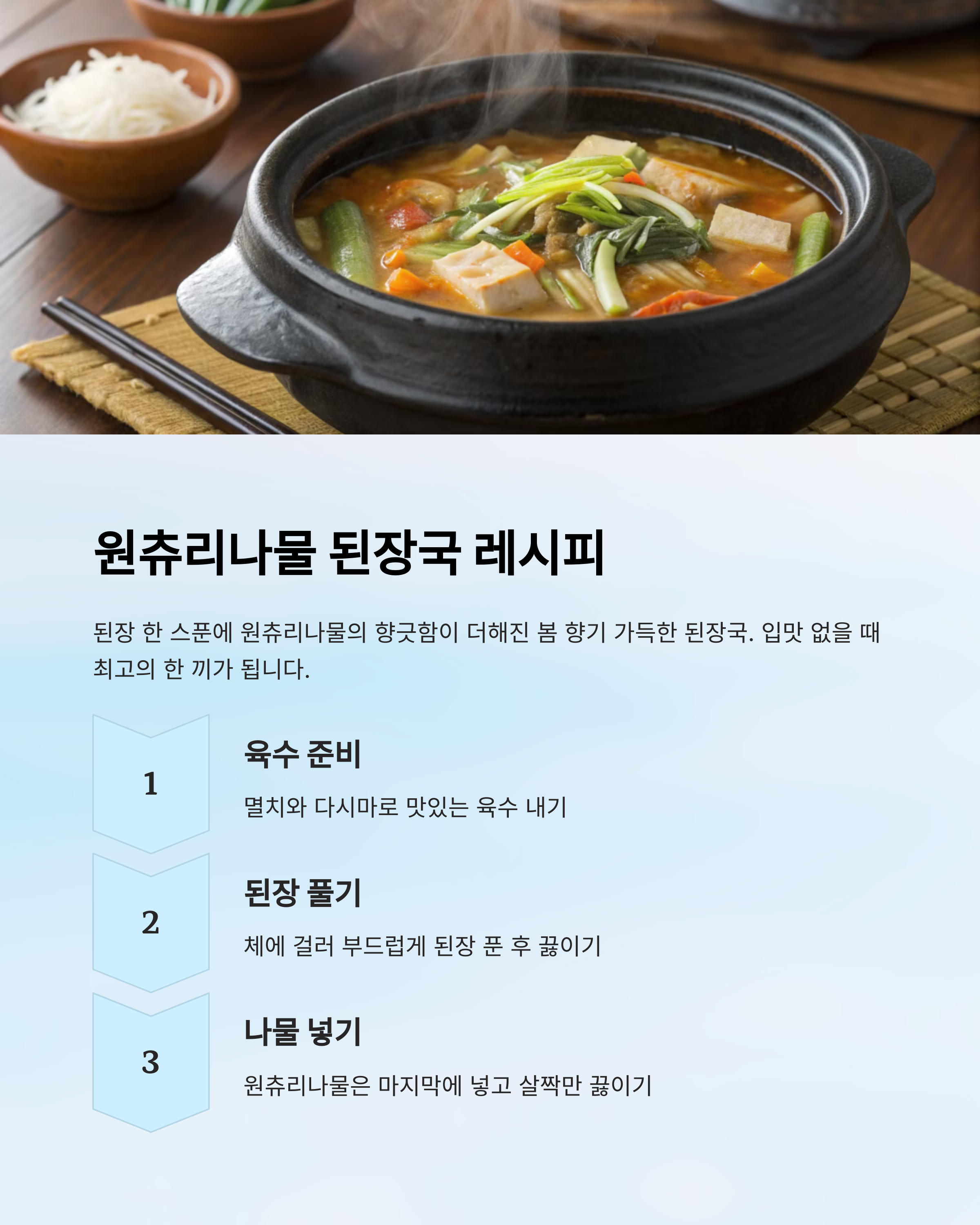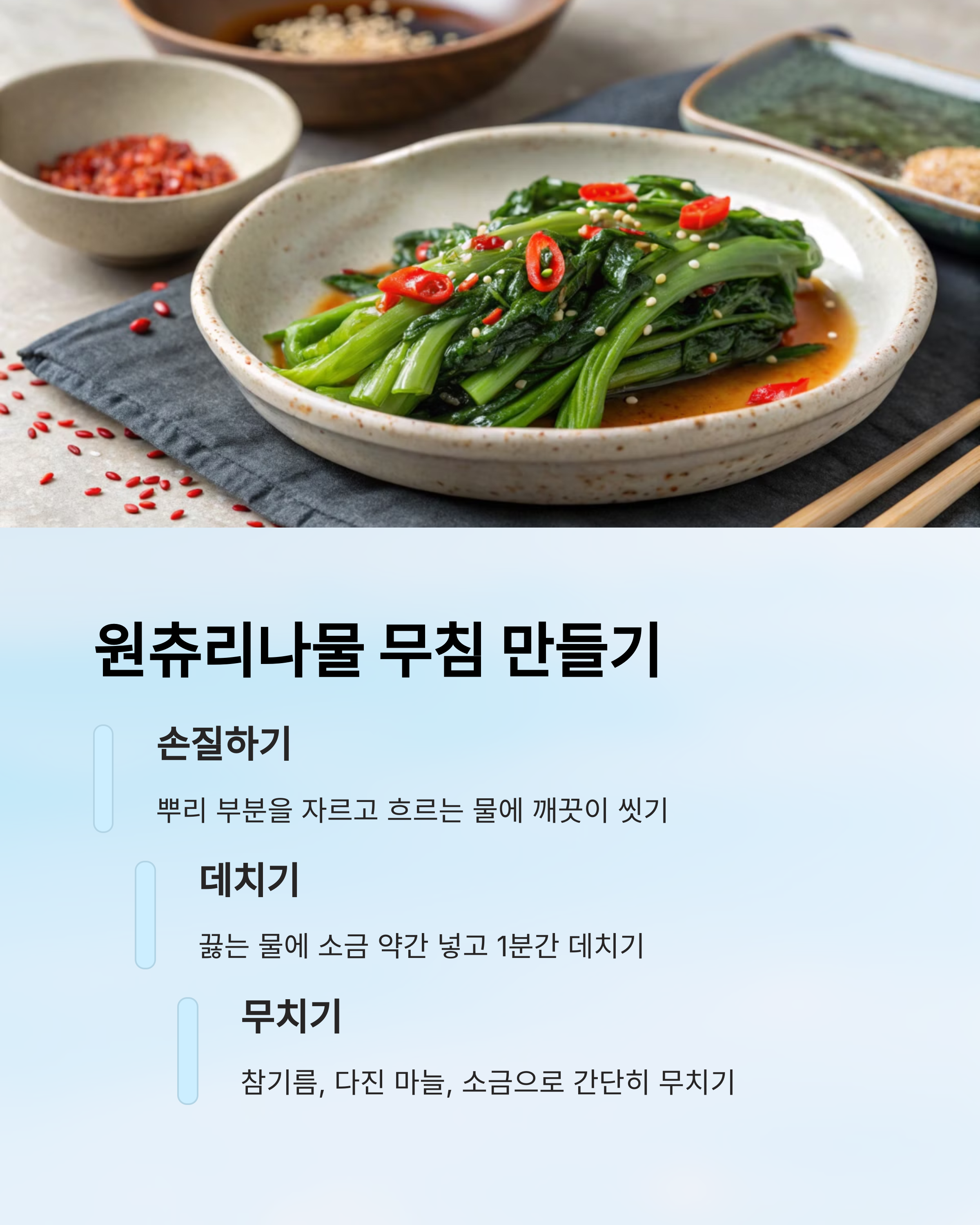 원츄리나물은 간단하게 조리해도 특유의 향과 식감 덕분에 아주 맛있게 즐길 수 있어요. 특히 쌉쌀한 향과 부드러운 질감이 밥반찬, 국물요리, 심지어 비빔요리까지 두루 잘 어울리죠. 아래에 제가 자주 해 먹는 방식 5가지를 소개할게요!