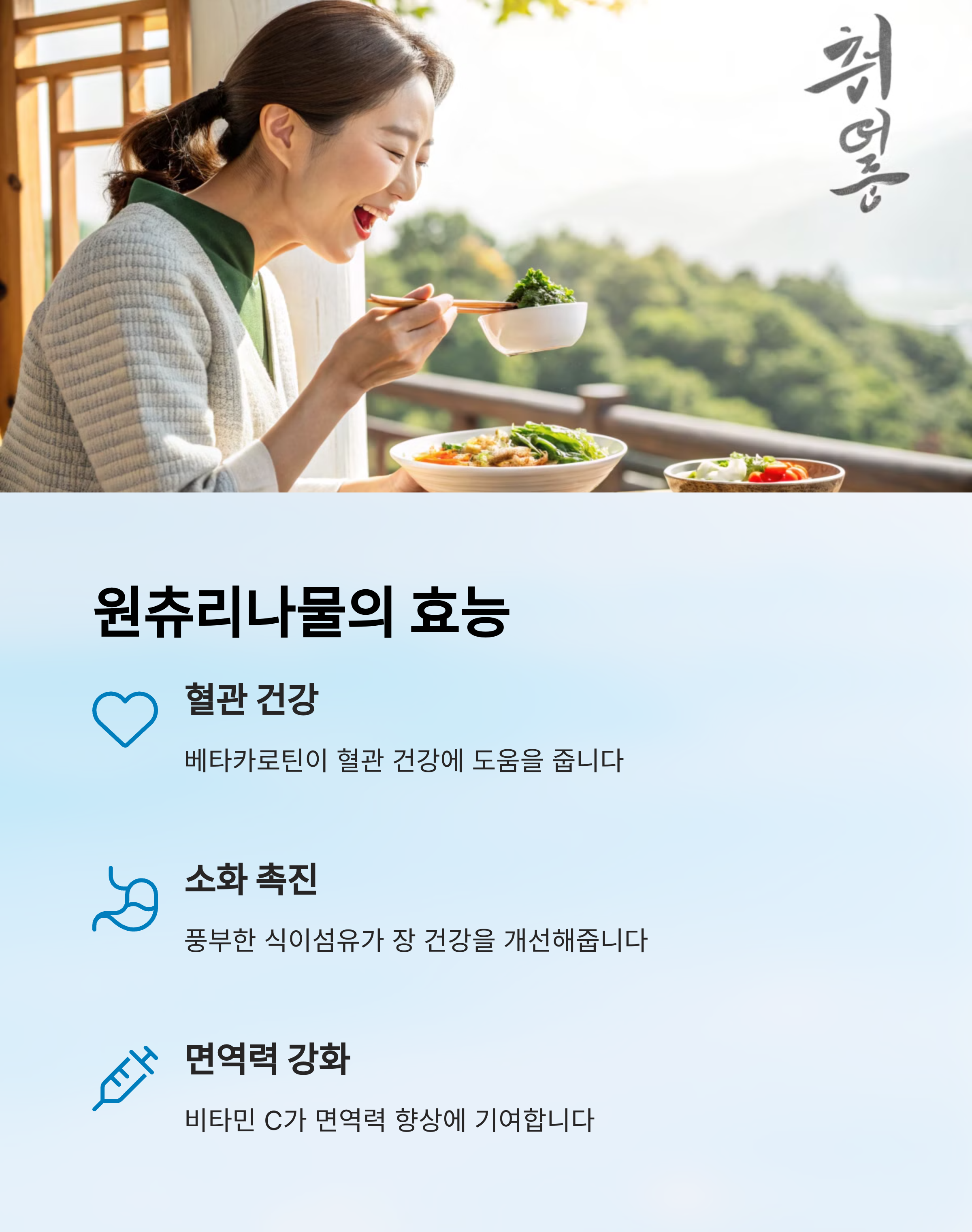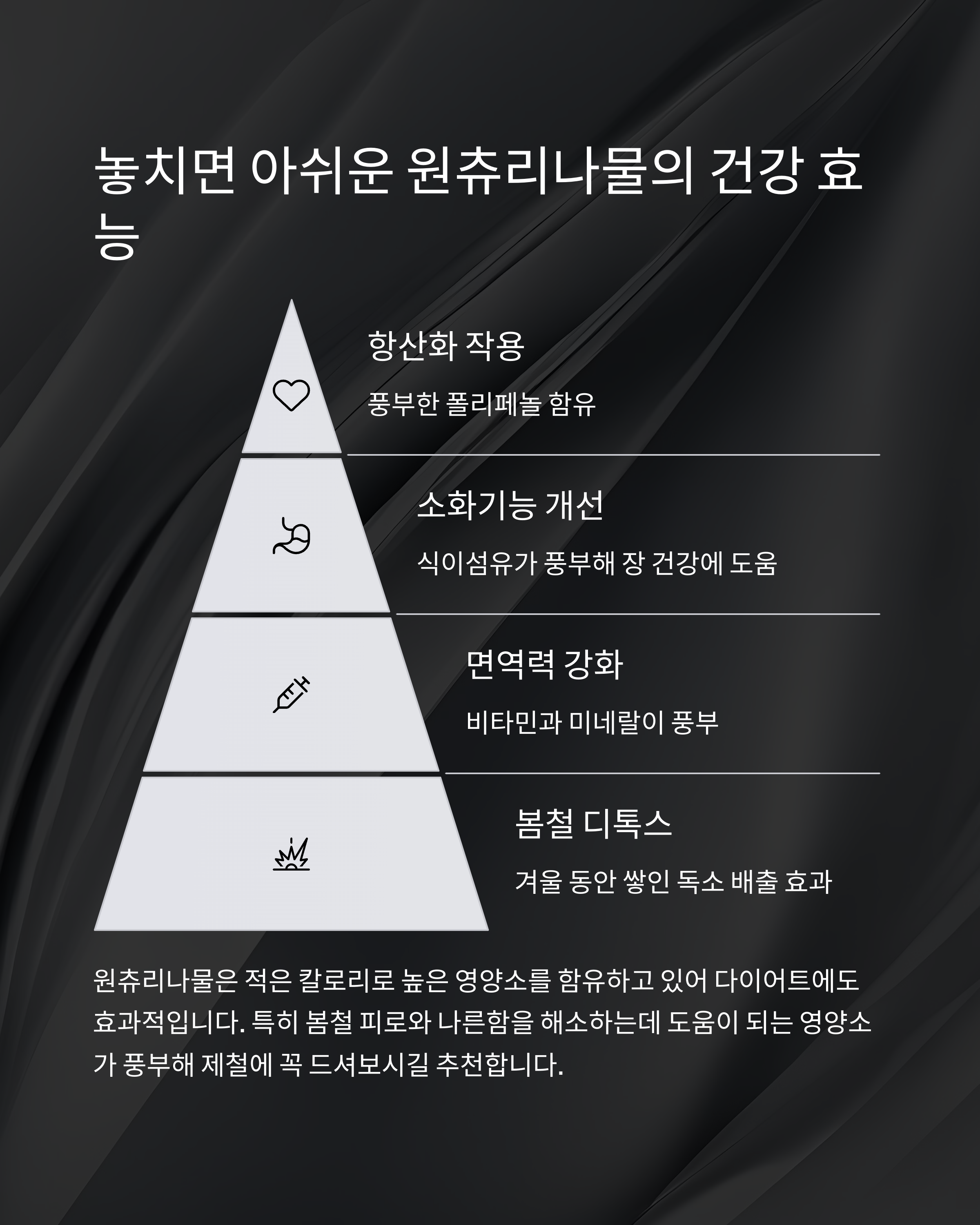 원츄리나물은 단순히 봄 향기를 전하는 나물이 아니에요. 그 안에는 놀라울 정도로 다양한 건강 성분이 숨어 있죠. 비타민 A, C, 식이섬유, 칼륨, 베타카로틴이 풍부하게 함유돼 있어요. 특히 간 해독을 도와주는 효과가 있어, 봄철 피로 해소와 면역력 강화에 그만이죠. 아래 표에서 주요 성분과 효능을 정리해봤어요.