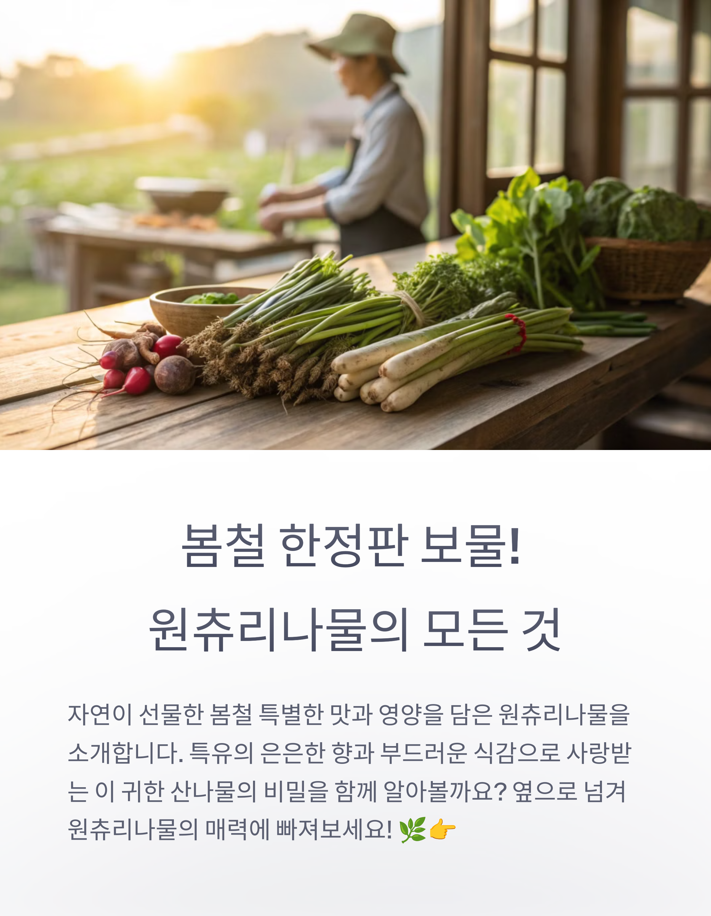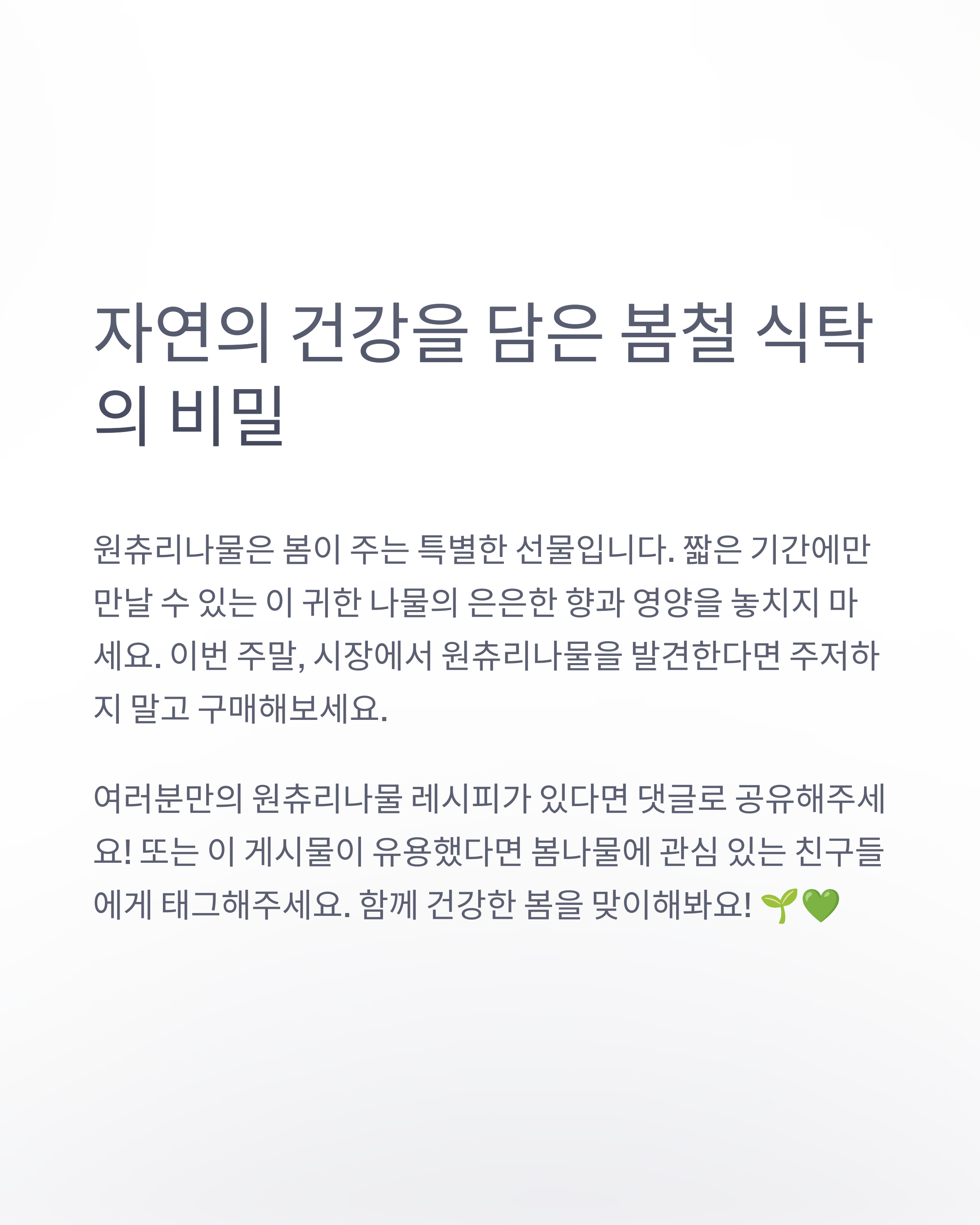 오늘 소개한 원츄리나물, 어떠셨나요? 봄이 입안에서 살아나는 기분이 들지 않으셨나요? 제철 식재료는 우리 몸에 가장 필요한 영양을 자연스럽게 채워주는 선물이에요. 혹시 마트나 시장에서 원츄리나물을 마주친다면 망설이지 말고 한 줌 집어보세요. 그리고 오늘 소개한 방법 중 하나로 간단히 조리해 보시면 그 매력을 확실히 느끼실 수 있을 거예요. 여러분만의 원츄리나물 요리법이 있다면 댓글로 공유해 주세요! 함께 맛있는 봄을 나눠요 🌿😊