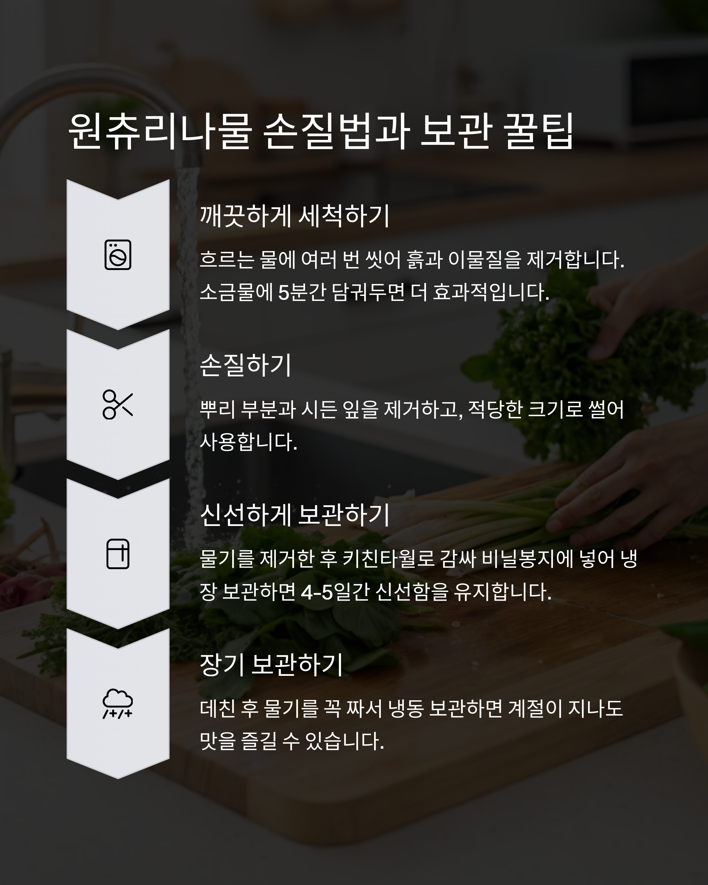 원츄리나물은 수분 함량이 많고 여린 잎이라 오래 두면 금방 시들거나 질겨지기 쉬워요. 가능한 한 구입 당일 손질하고 조리하는 것이 가장 좋아요. 그래도 보관이 필요할 경우엔, 아래 방법을 참고해보세요.