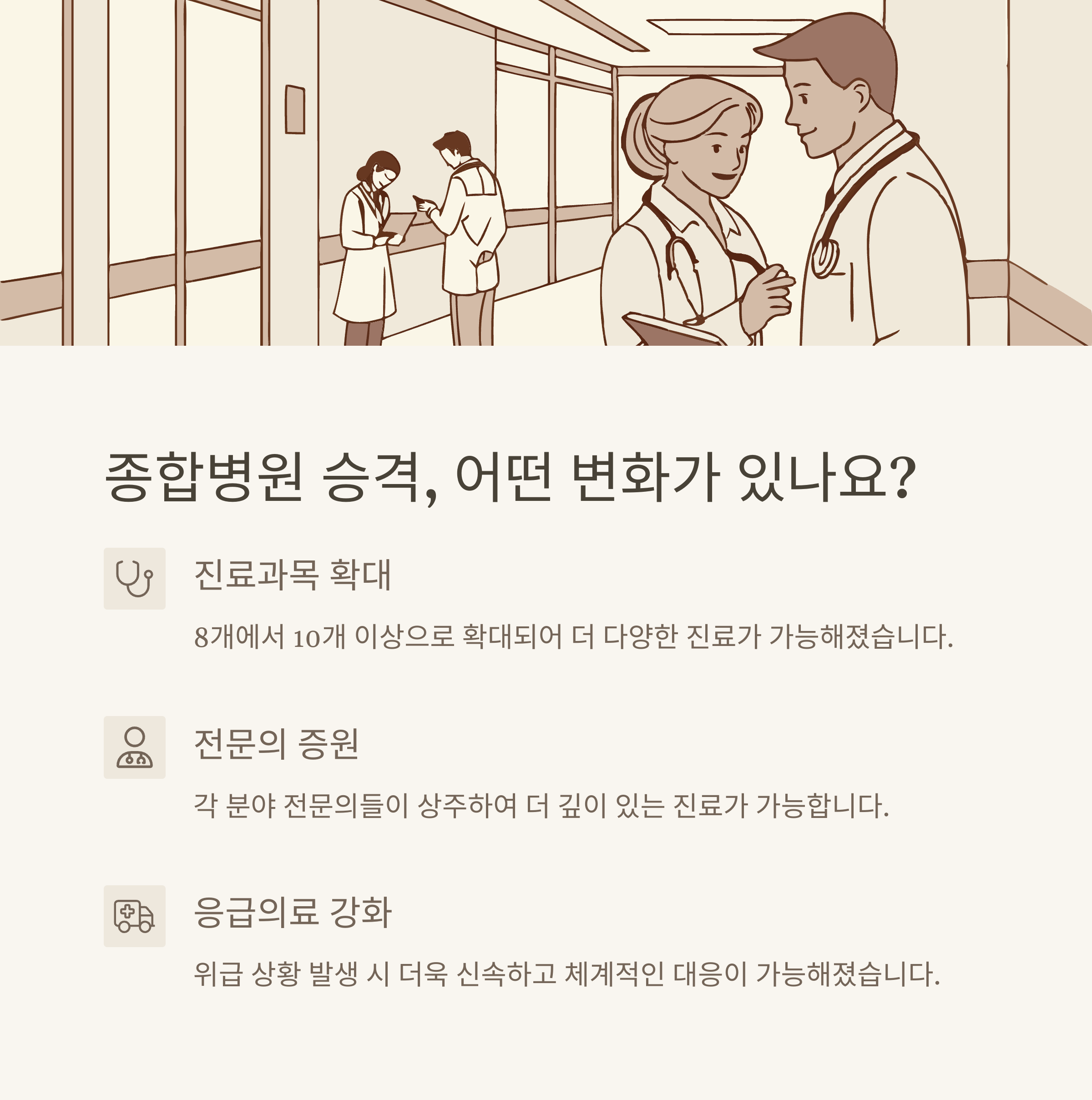 - 전문의 증원: 각 분야의 전문의들이 상주하여 더 깊이 있는 진료가 가능해져요.