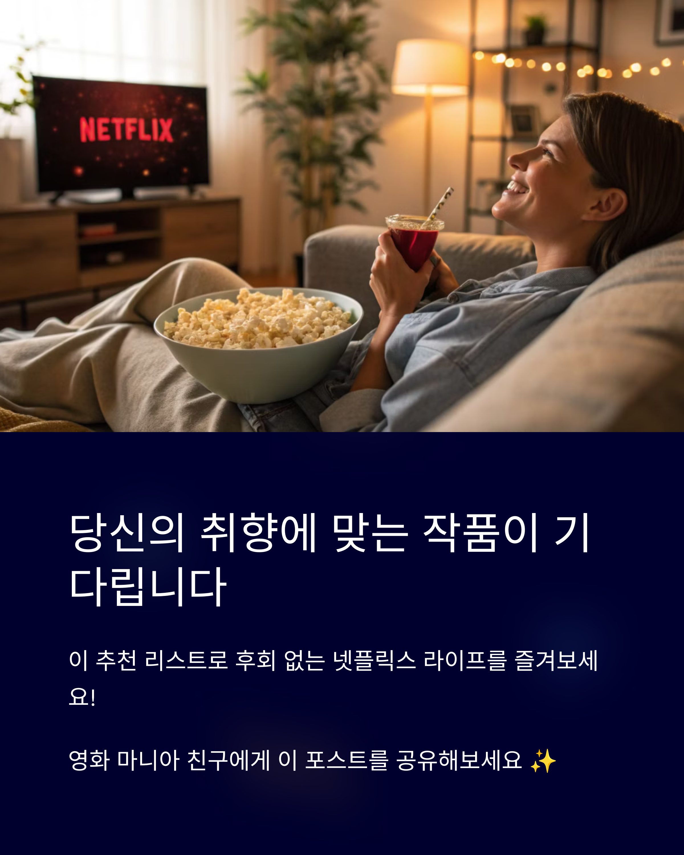 이제 어떤 영화를 볼지 더는 고민하지 않아도 되겠죠? 오늘 추천한 넷플릭스 영화들은 제가 직접 보고, 또 주변 지인들에게도 반응이 좋았던 작품들만 추려봤어요. 4월이라는 계절에 딱 어울리는 감성부터 짜릿한 몰입까지, 다양한 장르로 골라봤으니 꼭 한 편씩 챙겨보시고, 여러분의 인생 영화도 찾아보시길 바라요. 혹시 이 리스트에 없는 숨은 명작이 있다면 댓글로 공유해주세요! 우리끼리만 아는 영화 보물지도 만들어봐요 :)