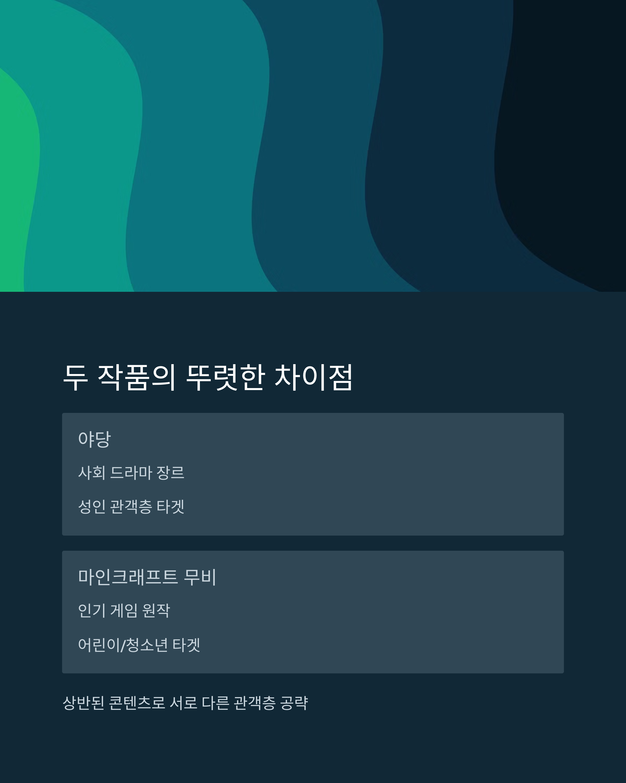 '야당'과 '마인크래프트 무비'는 목표로 하는 관객층이 명확히 다릅니다. '야당'은 정치/사회 이슈에 관심 많은 30~50대 성인층을 타깃으로 삼고 있으며, '마인크래프트 무비'는 키즈 및 패밀리층, 그리고 원작 게임 팬들을 주요 타겟으로 설정하고 있습니다. 이처럼 뚜렷한 세대별 관심 차이가 승부의 열쇠가 될 전망입니다.