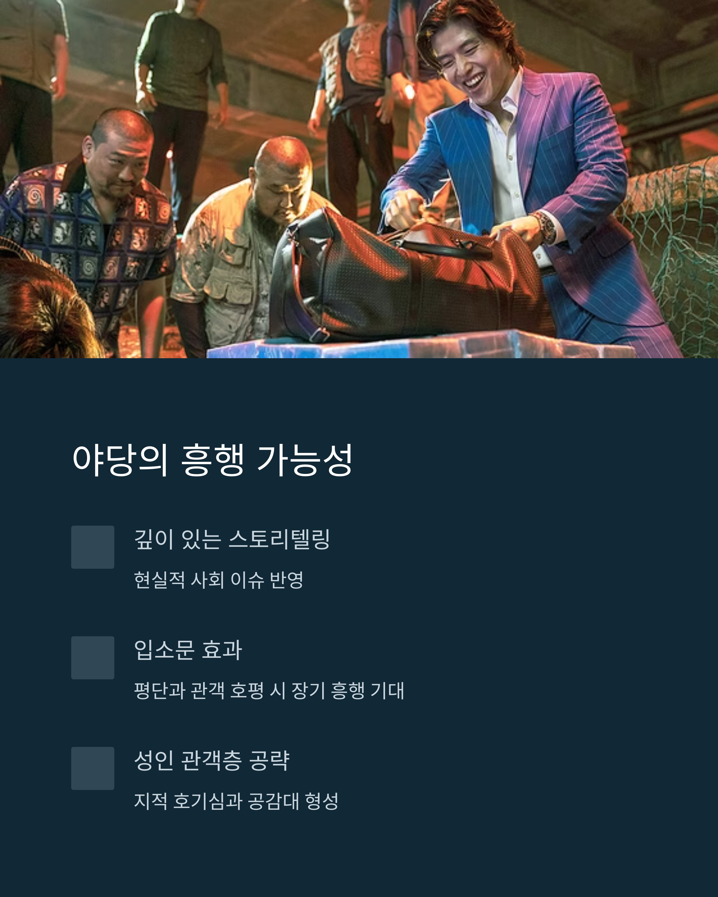 - 사회적 이슈와 입소문에 따라 '야당' 흥행 역주행 가능성 존재