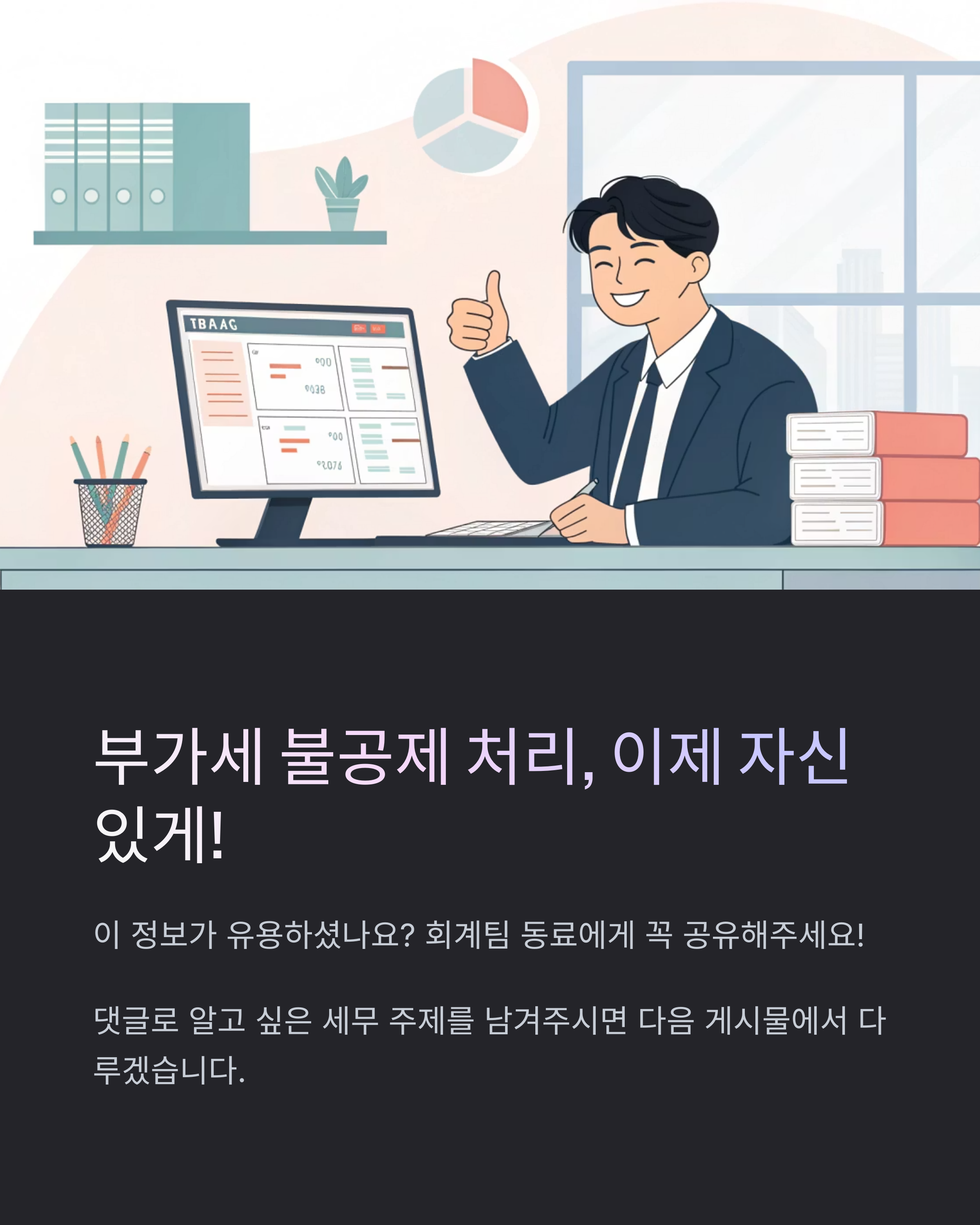 이번 글을 통해 부가세 불공제 분개에 대해 조금이나마 명확해지셨길 바랍니다. 최근 실무에서도 자주 발생하는 실수들이 반복되는 것을 보며, 기본 개념과 최신 규정의 이해가 얼마나 중요한지 다시금 느꼈습니다. 여러분도 혹시 분개 처리 중 고민되는 부분이 있다면 댓글로 남겨주세요! 실제 사례 중심으로 추가 설명도 드릴게요.