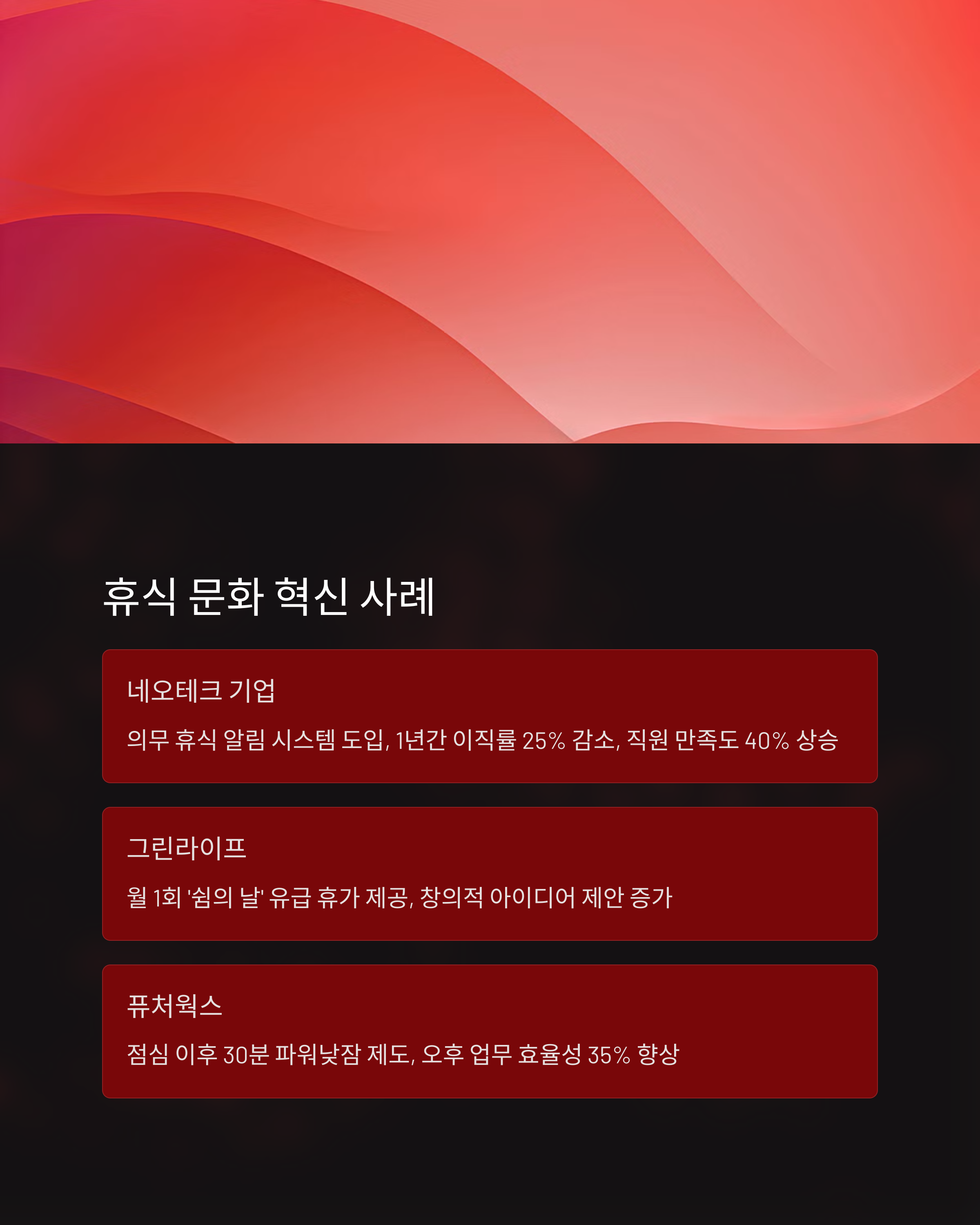2025년 3월, 한국경제연구원 발표에 따르면 구글코리아, 카카오엔터프라이즈 등은 자유로운 휴식 제도를 도입하여 이직률을 크게 낮추는 데 성공했습니다.