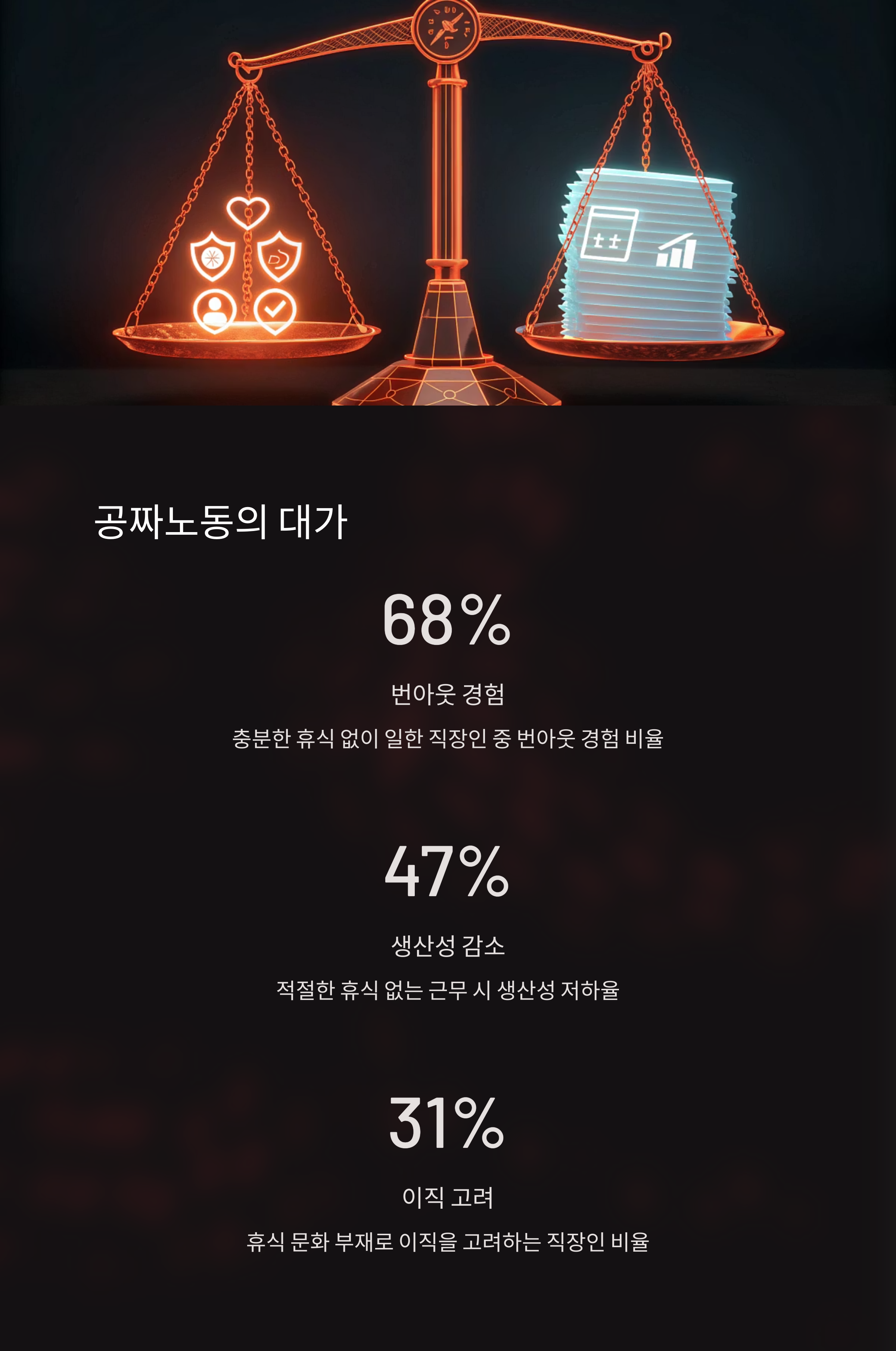 아닙니다. 조직의 생산성과 이미지에도 영향을 미칩니다. 쉬지 못하는 조직은 장기적으로 경쟁력을 잃게 되죠.