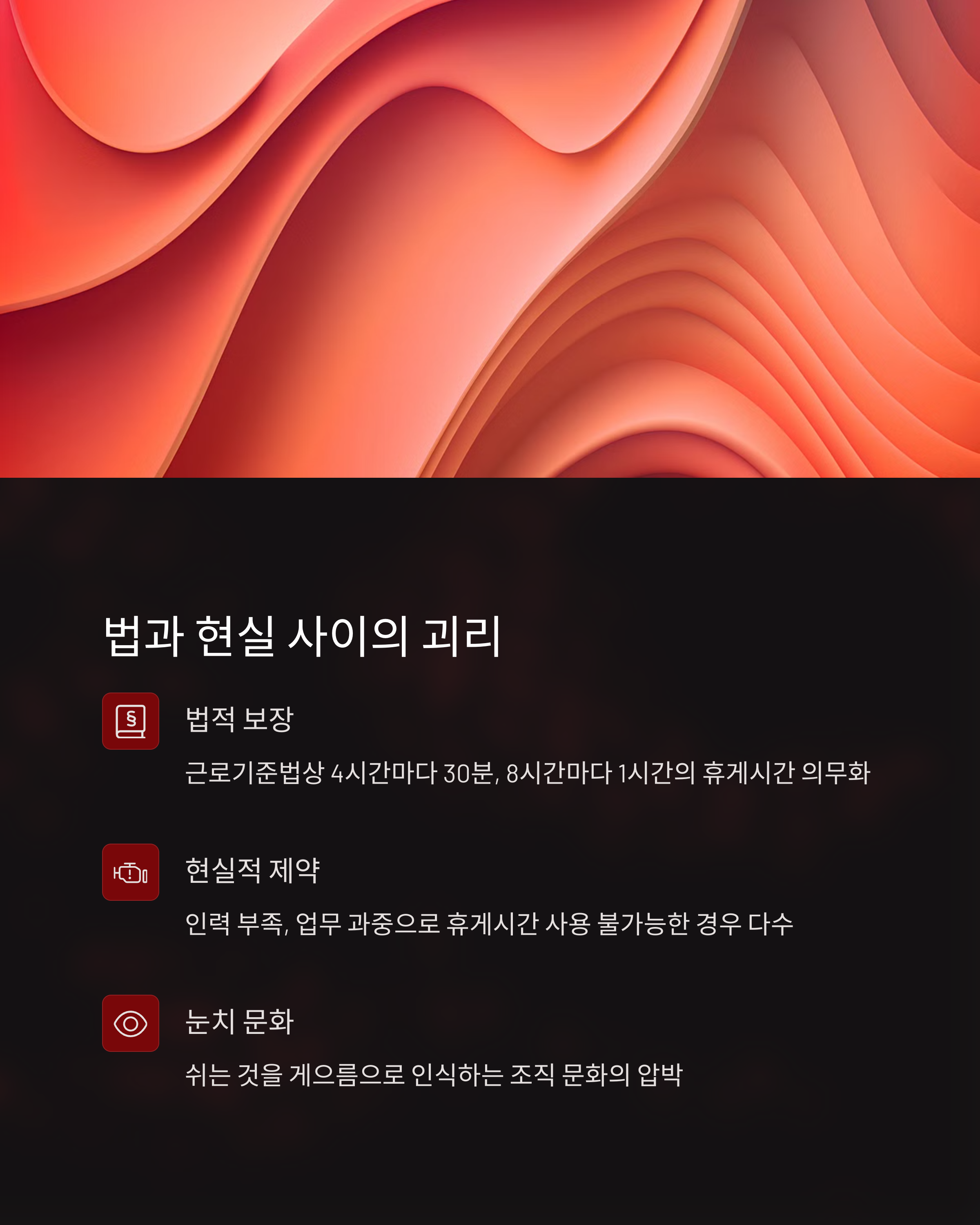 우리나라 근로기준법 제54조는 “4시간 근무 시 30분, 8시간 근무 시 1시간 이상의 휴게시간”을 법적 의무로 규정하고 있어요. 하지만 실제 현장에서는 이 권리가 얼마나 지켜지고 있을까요?