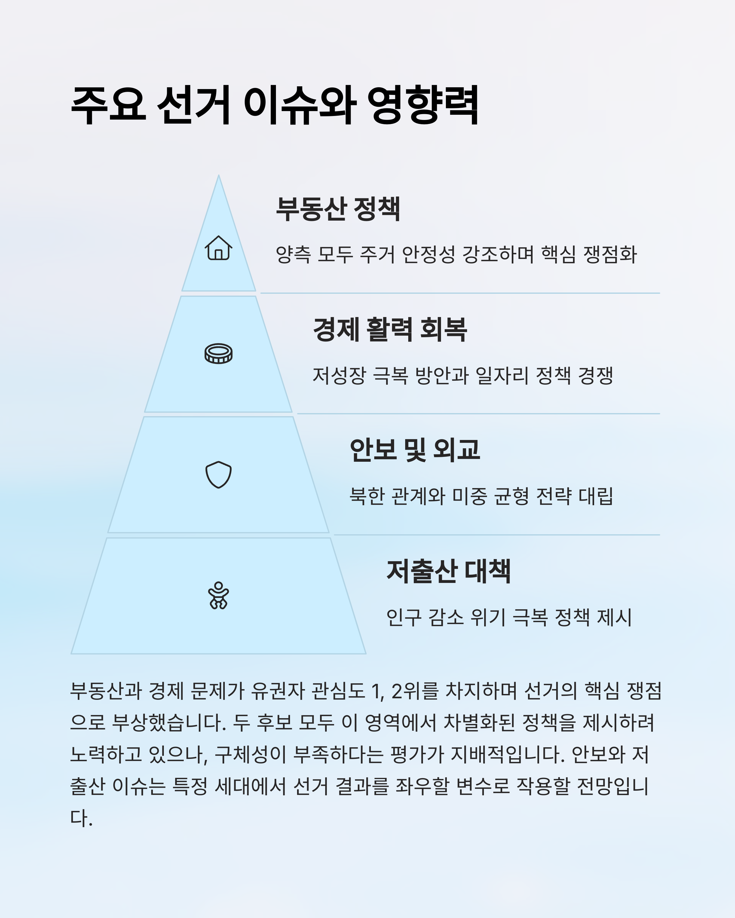 정책보다 이슈가 표심을 흔드는 시대, 이번 2025년 대선 역시 ‘감성 이슈’가 판세를 크게 흔들 전망입니다. 특히 부동산, 청년 일자리, 연금개혁 같은 생활밀착형 문제들이 유권자의 반응을 민감하게 자극하고 있어요. 여기에 정치적 진실성, 도덕성 논란, 검찰 개혁 같은 정치 공방 이슈도 뜨거운 감자입니다. 각 후보 진영은 이 이슈를 중심으로 프레임 싸움을 벌이고 있죠. 이슈 하나가 후보의 지지율을 바꿔놓는 요즘,정책보다 감정의 선택이 더 큰 변수가 되고 있습니다.