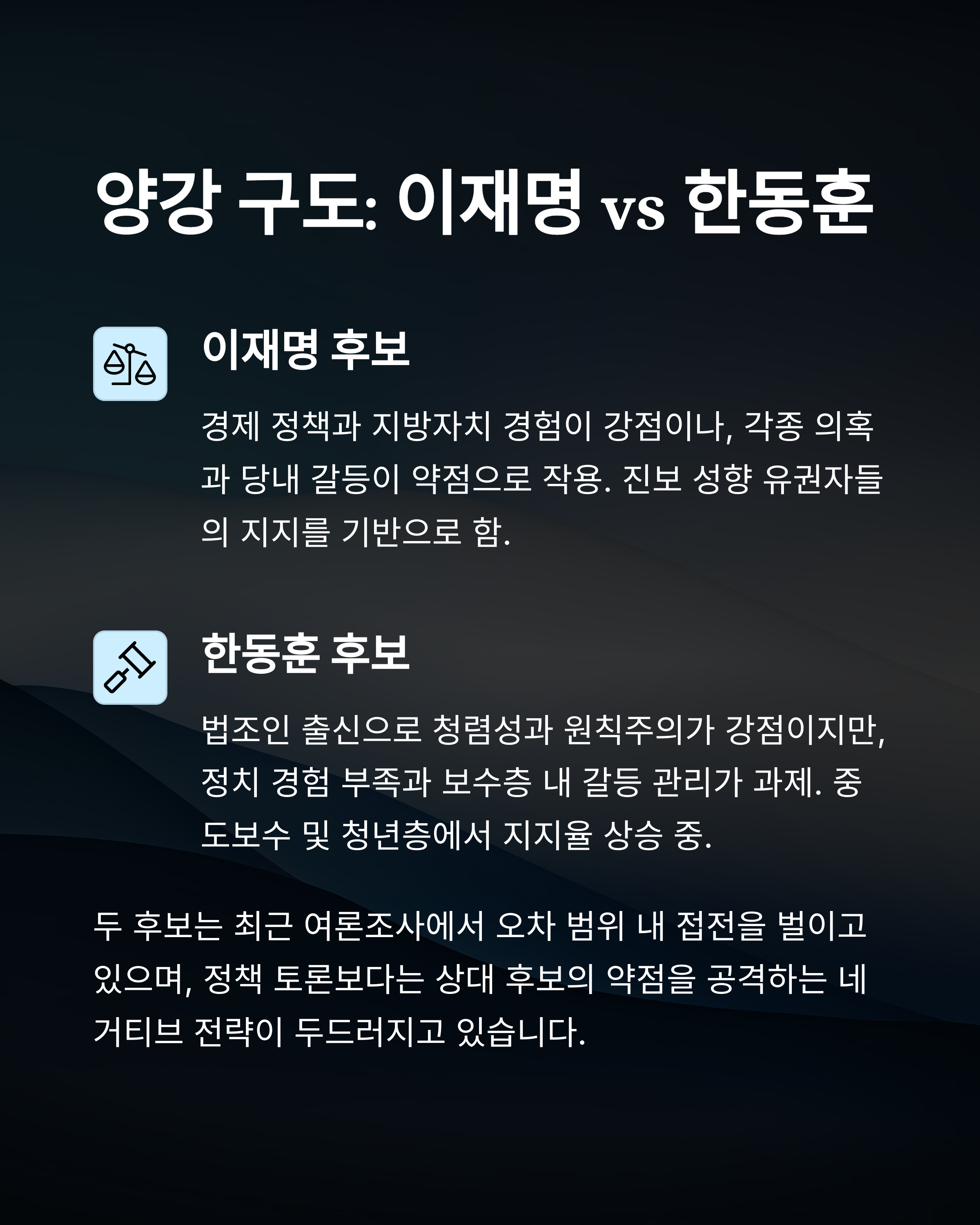 | 한동훈 | 청렴 이미지, 강한 개혁 드라이브 | 정치 경험 부족, 당내 갈등 변수 |