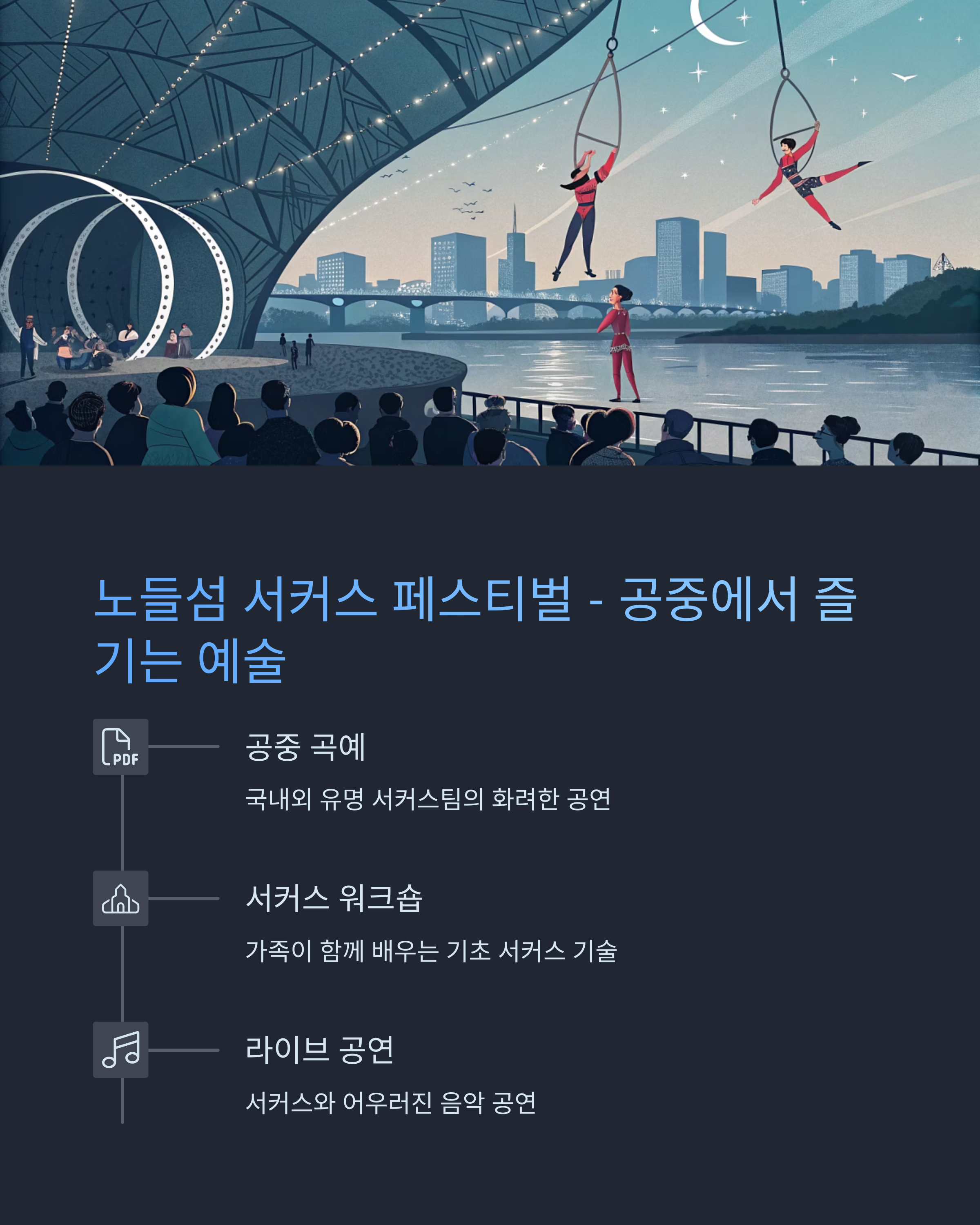 | 노들섬 서커스 페스티벌 | 노들섬 | 국내외 서커스 공연, 체험 부스 |
