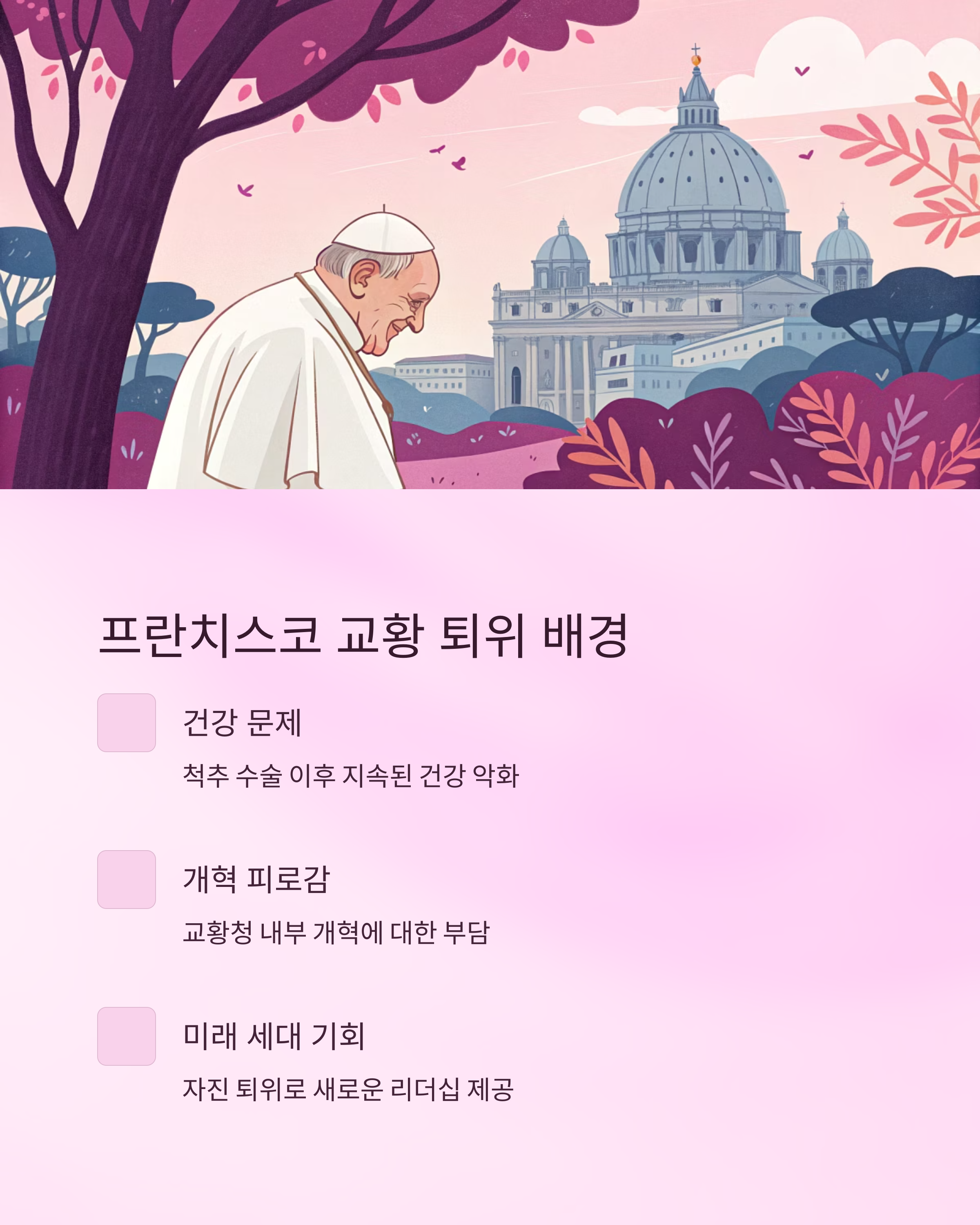 프란치스코 교황은 2013년부터 교황직을 수행하며 '가난한 자의 교황', '환경의 교황'이라는 수식어와 함께 많은 개혁을 시도해왔습니다. 그러나 최근 몇 년간 건강 악화와 더불어 신중한 퇴위 준비설이 계속되었으며, 2025년 초에 전격 퇴위 선언을 발표했습니다.