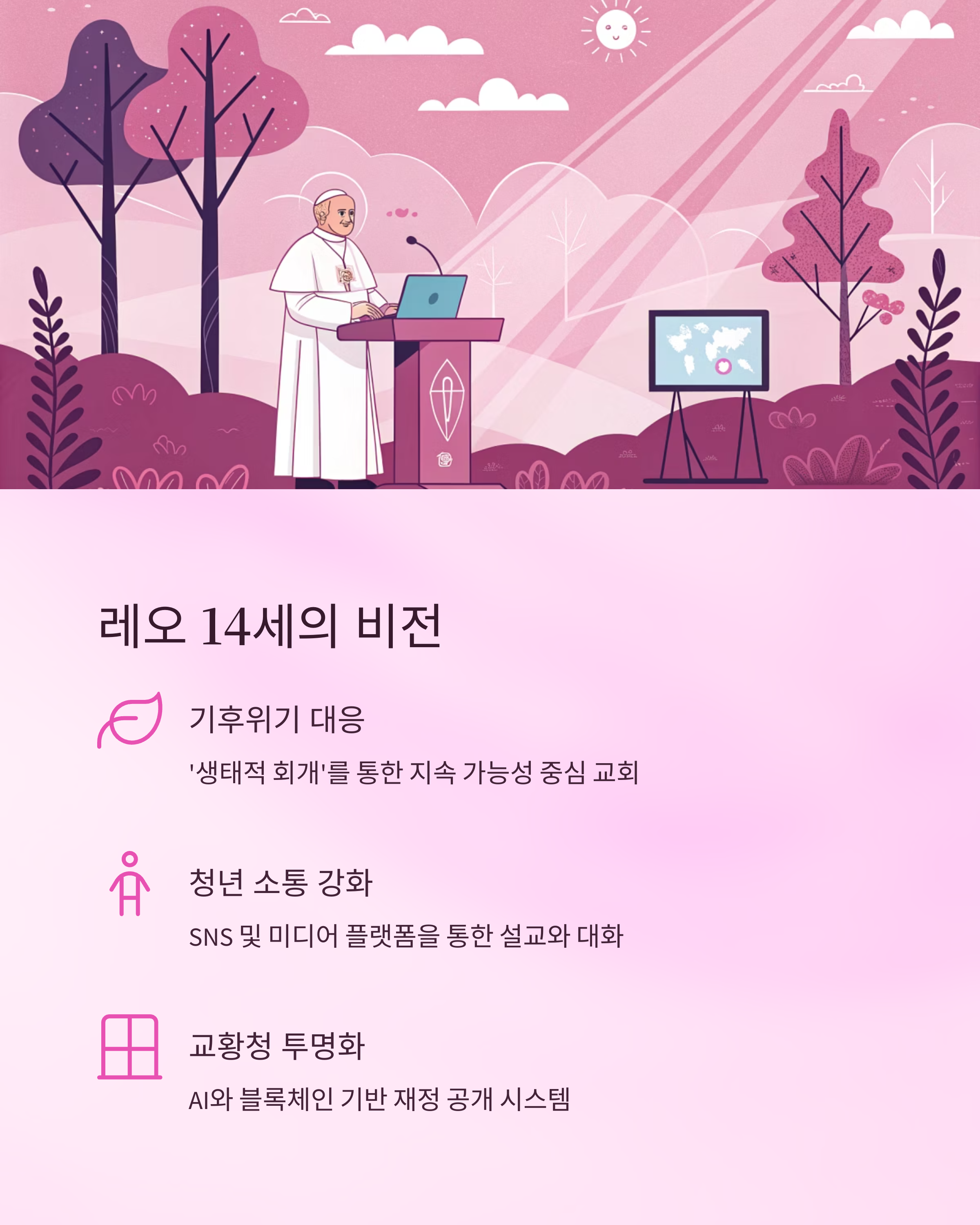 AI 윤리 정립, 기후위기 대응, 디지털 교회 구축 등 기술과 종교의 융합에 중점을 두고 있습니다.레오 14세는 전임 교황들과 어떻게 다르나요?