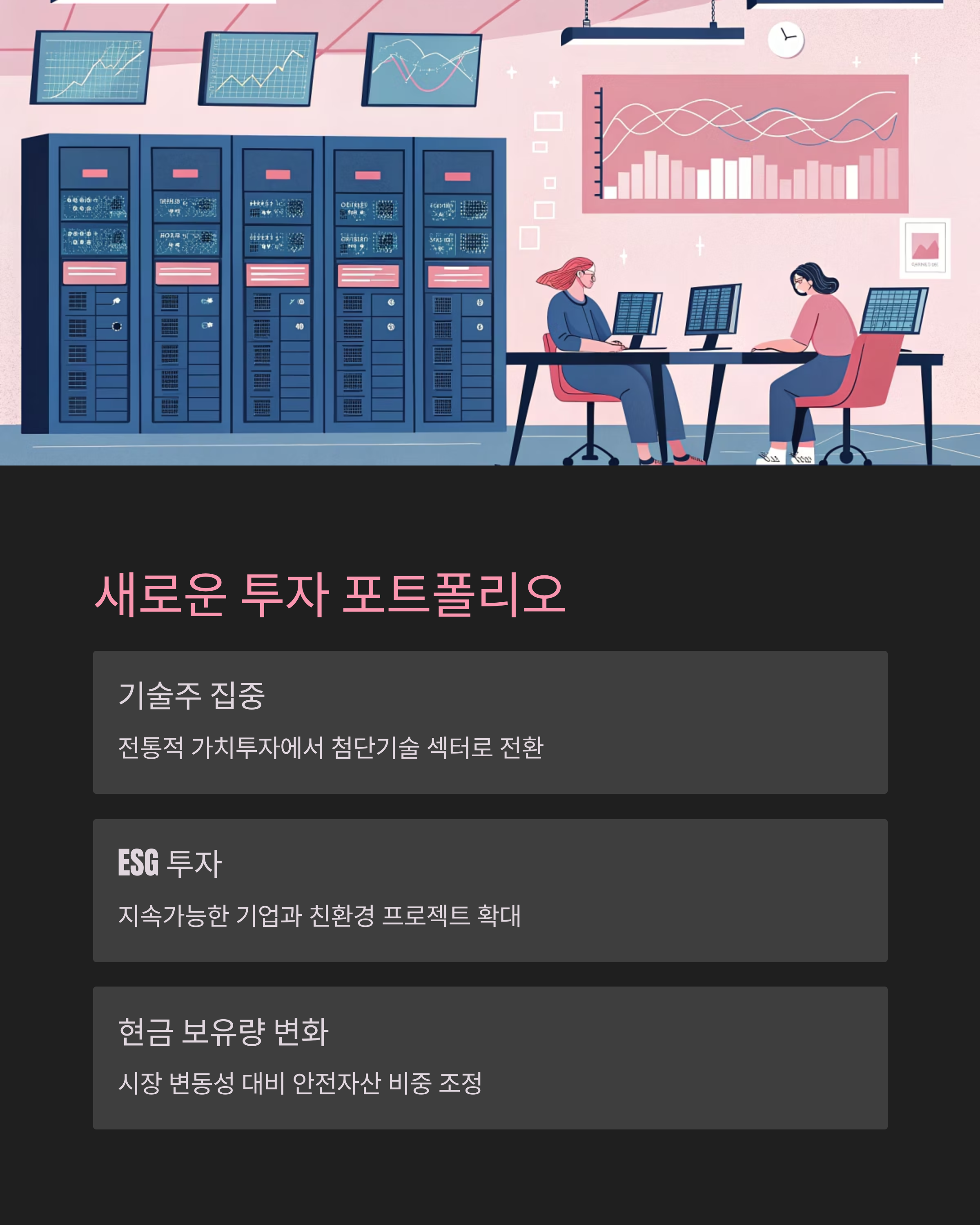 기술주와 ESG 관련 종목 비중을 확대하며, 금융 섹터는 일부 축소했습니다. 이는 시장 트렌드에 맞춘 전환으로 해석됩니다.