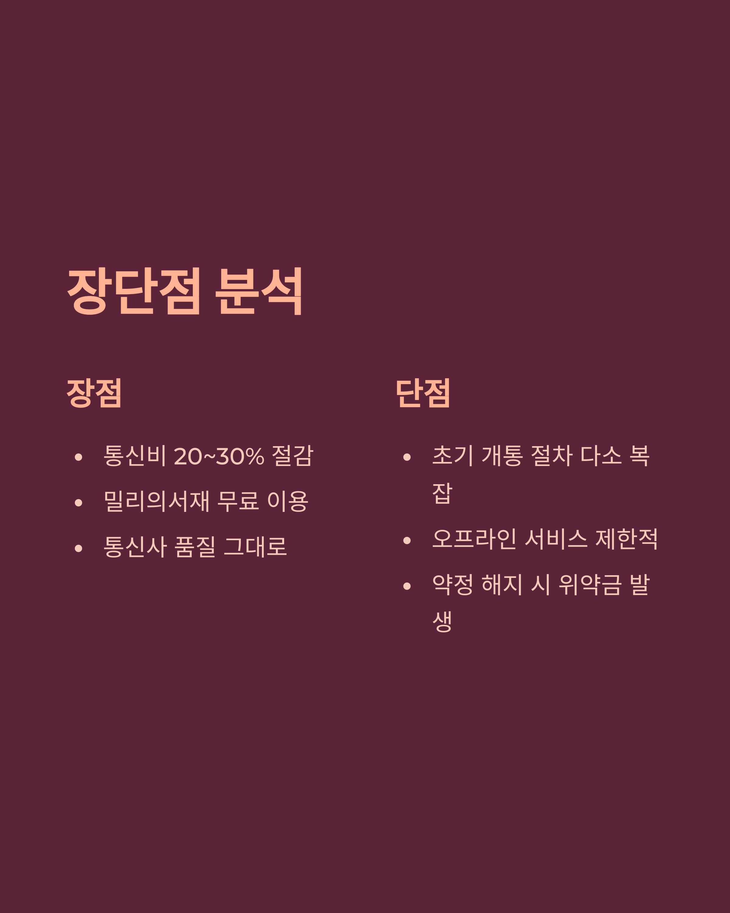 - 장점: 통신비 절감 효과 확실 (매달 2만 원 이상 절약)