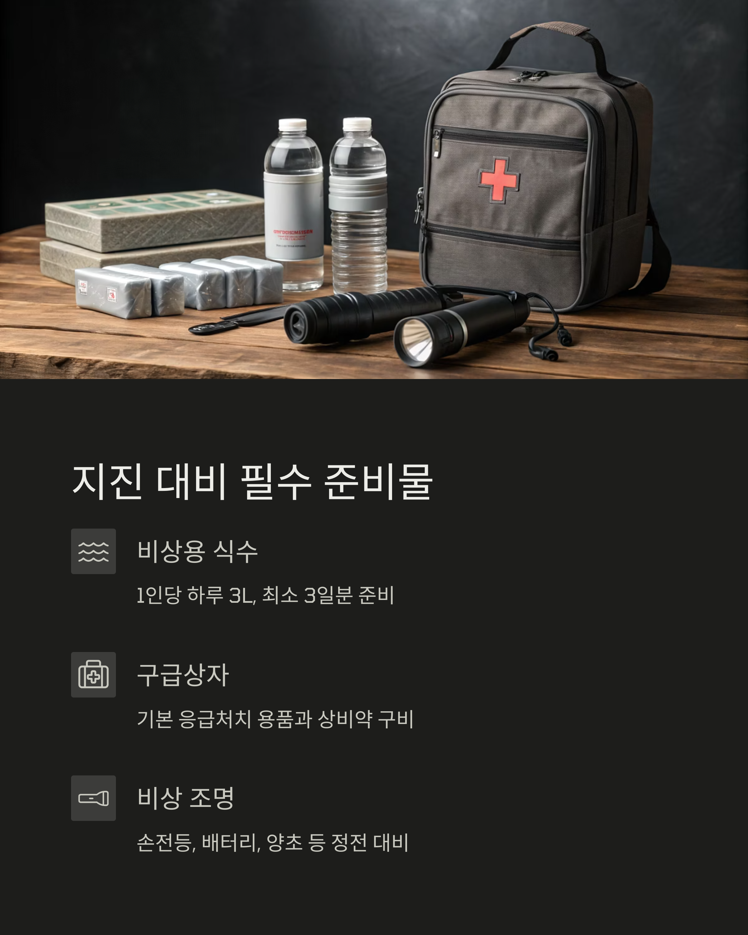 손전등, 건전지, 식수, 응급약품, 보조배터리, 비상식량 등 최소 3일 이상 생존 가능한 물품을 준비해야 합니다.