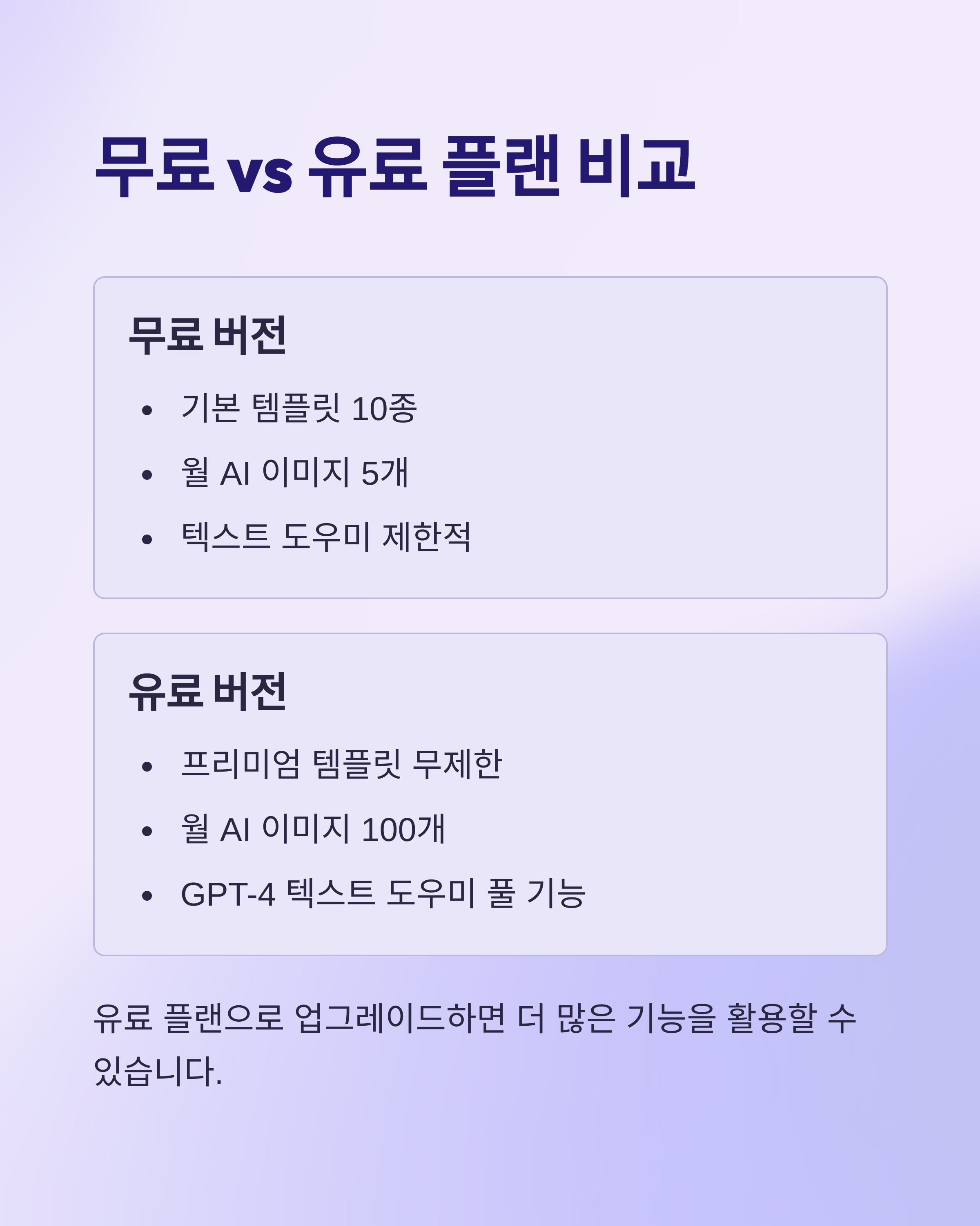 기본 템플릿, 이미지, 텍스트 작업 등은 충분히 가능하지만 AI 기반 기능이나 고급 에셋은 제한됩니다. 잦은 사용자가 아니라면 무료도 꽤 괜찮아요.