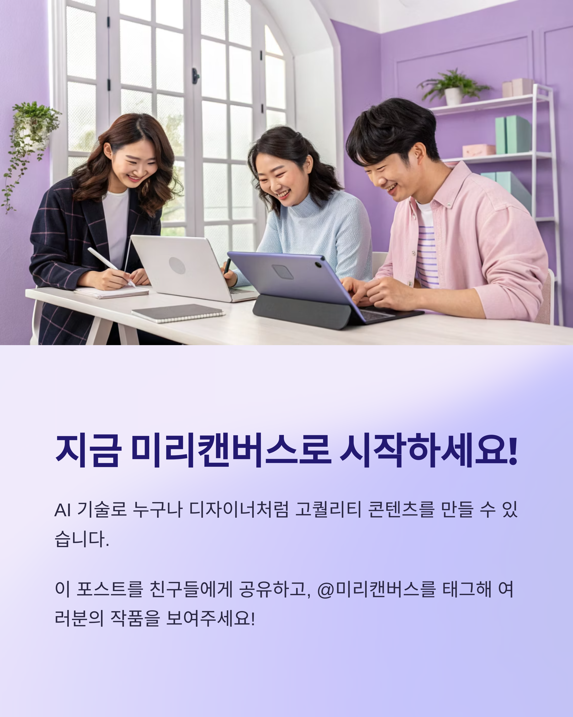 오늘도 긴 글 읽어주셔서 정말 감사합니다 😊 여러분도 저처럼 디자인 실력이 부족하더라도, 미리캔버스를 활용해서 멋진 콘텐츠를 만들어보세요. 특히 2025년 들어 새롭게 추가된 AI 기능들은 콘텐츠 제작의 패러다임을 확 바꿔놓을 만큼 강력하니까요! 앞으로도 미리캔버스는 계속 진화할 테니, 함께 지켜보면서 더 재밌는 실험도 해보면 좋겠네요.