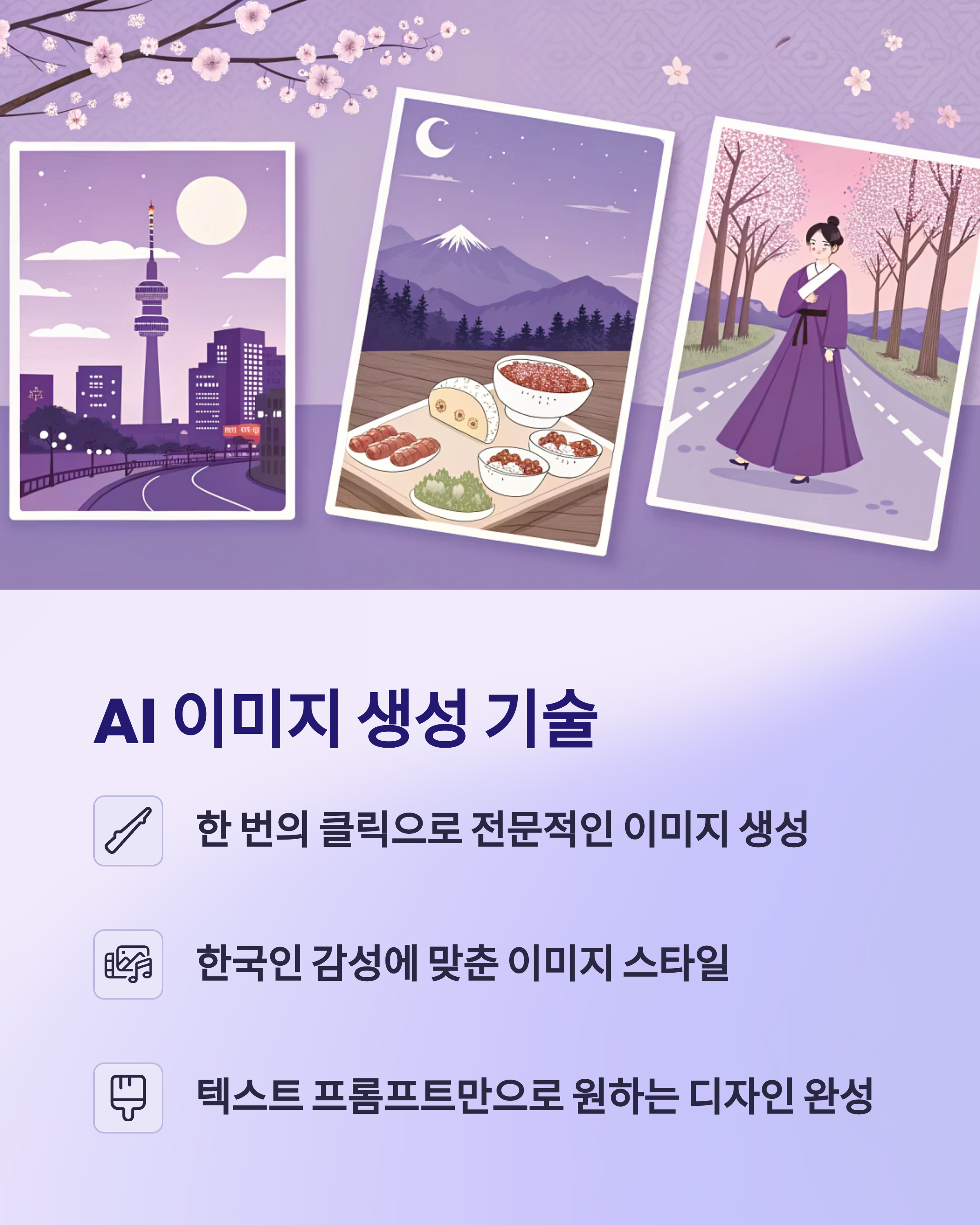 썸네일 제작, 포스터 디자인, 카드뉴스 등 다양한 시각 콘텐츠를 텍스트만으로 자동 제작할 수 있어요. 특히 브랜드 비주얼 정체성이 없는 소상공인이나 1인 창작자에게 큰 도움이 됩니다.