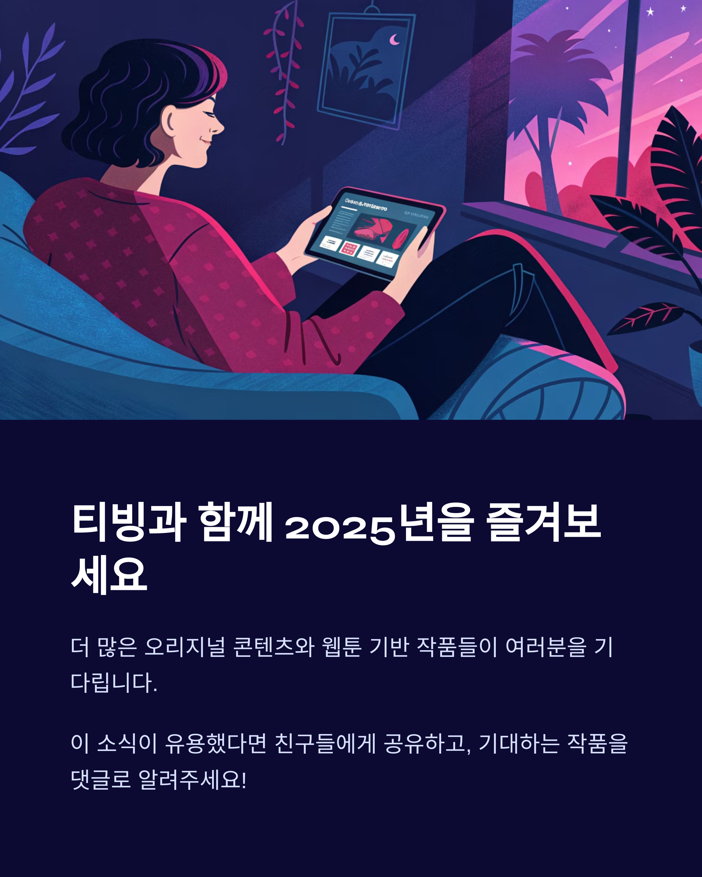 오늘은 2025년 티빙의 오리지널 콘텐츠 트렌드와 전략을 함께 살펴보았습니다. 여러분은 어떤 작품이 가장 기대되시나요? 댓글로 공유해주시면 함께 이야기를 나눠볼게요! OTT 시장의 흐름은 빠르게 변하고 있고, 티빙 역시 변화의 중심에 서 있습니다. 앞으로도 티빙의 새로운 시도와 콘텐츠 흐름을 꾸준히 모니터링하며 후속 포스팅으로 찾아뵙겠습니다.