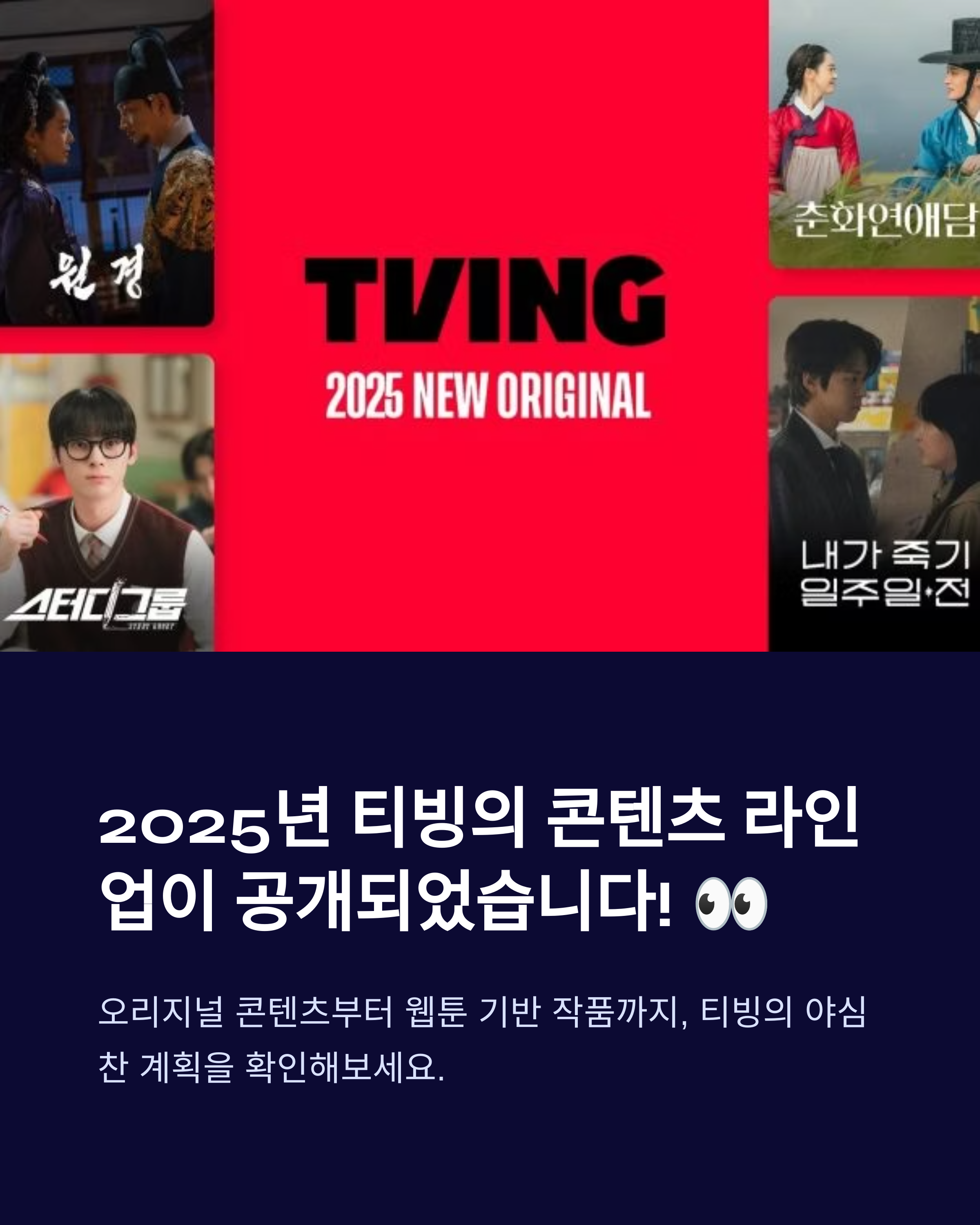 최근 저는 티빙에서 ‘스터디그룹’을 몰아보고 나서 완전히 빠져버렸습니다. 한 편 한 편에 진심이 느껴지는 콘텐츠가 점점 많아지고 있는데요, 알고 보니 2025년 티빙이 정말 야심 차게 라인업을 구성했더라고요! 오늘은 오리지널의 진화, 시즌제의 귀환, 그리고 웹툰 기반의 신작들까지 티빙의 현재와 미래를 함께 살펴보려 합니다.
