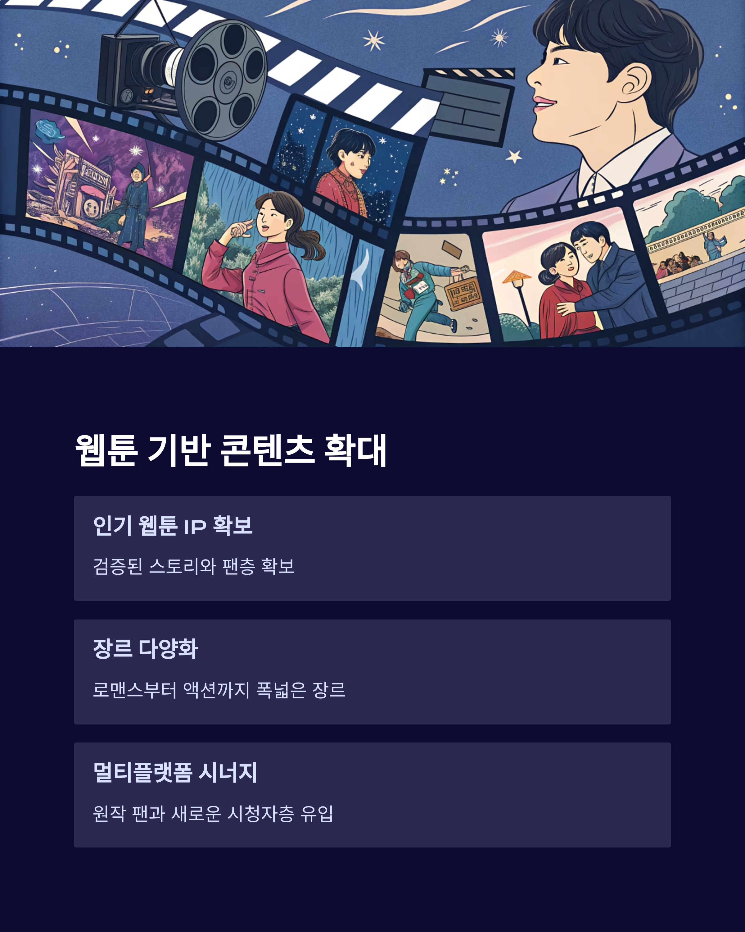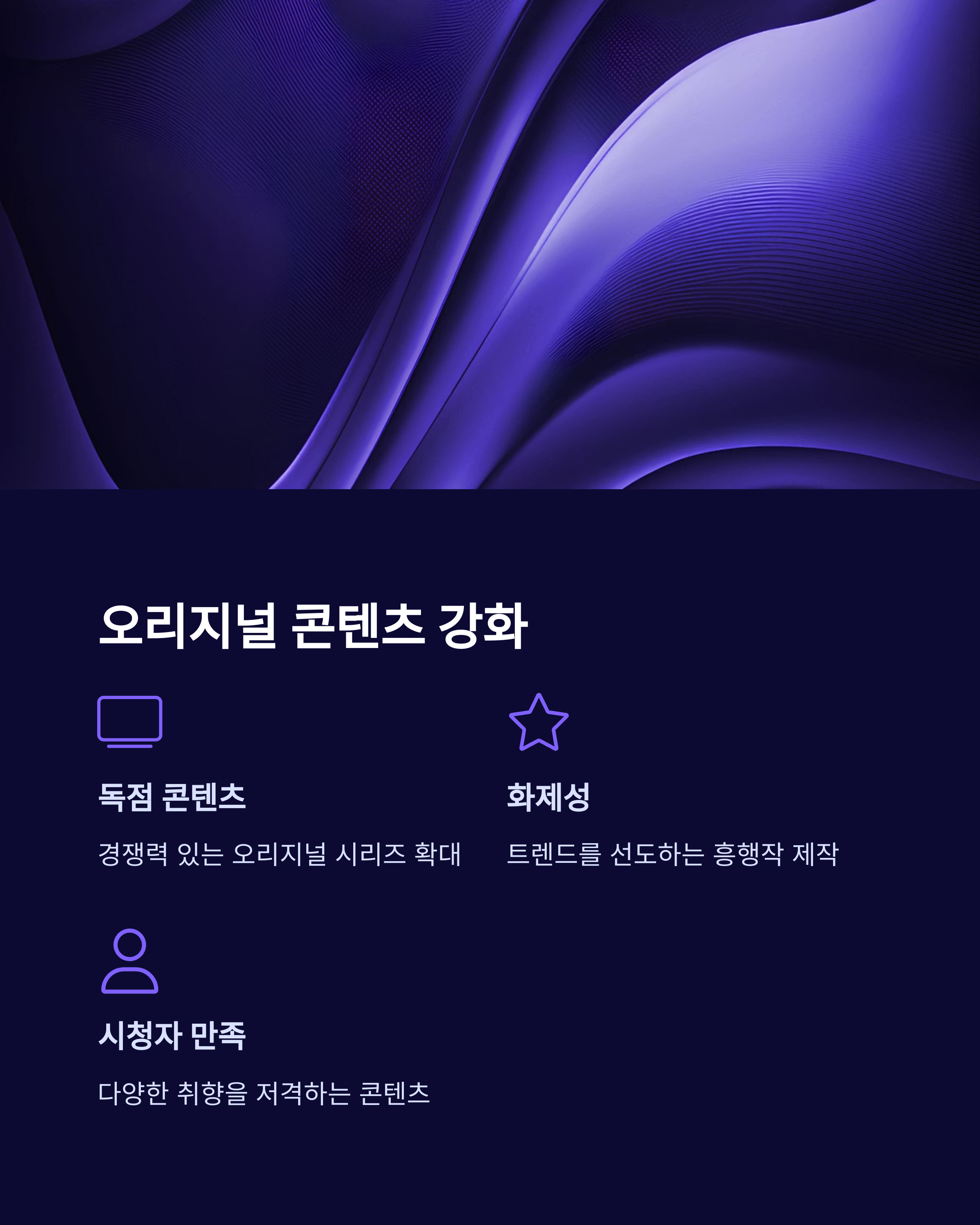 오리지널 강화, 웹툰 기반 콘텐츠 확대, 시즌제 시리즈 재편 등 자체 제작 중심 전략을 강화하고 있습니다.