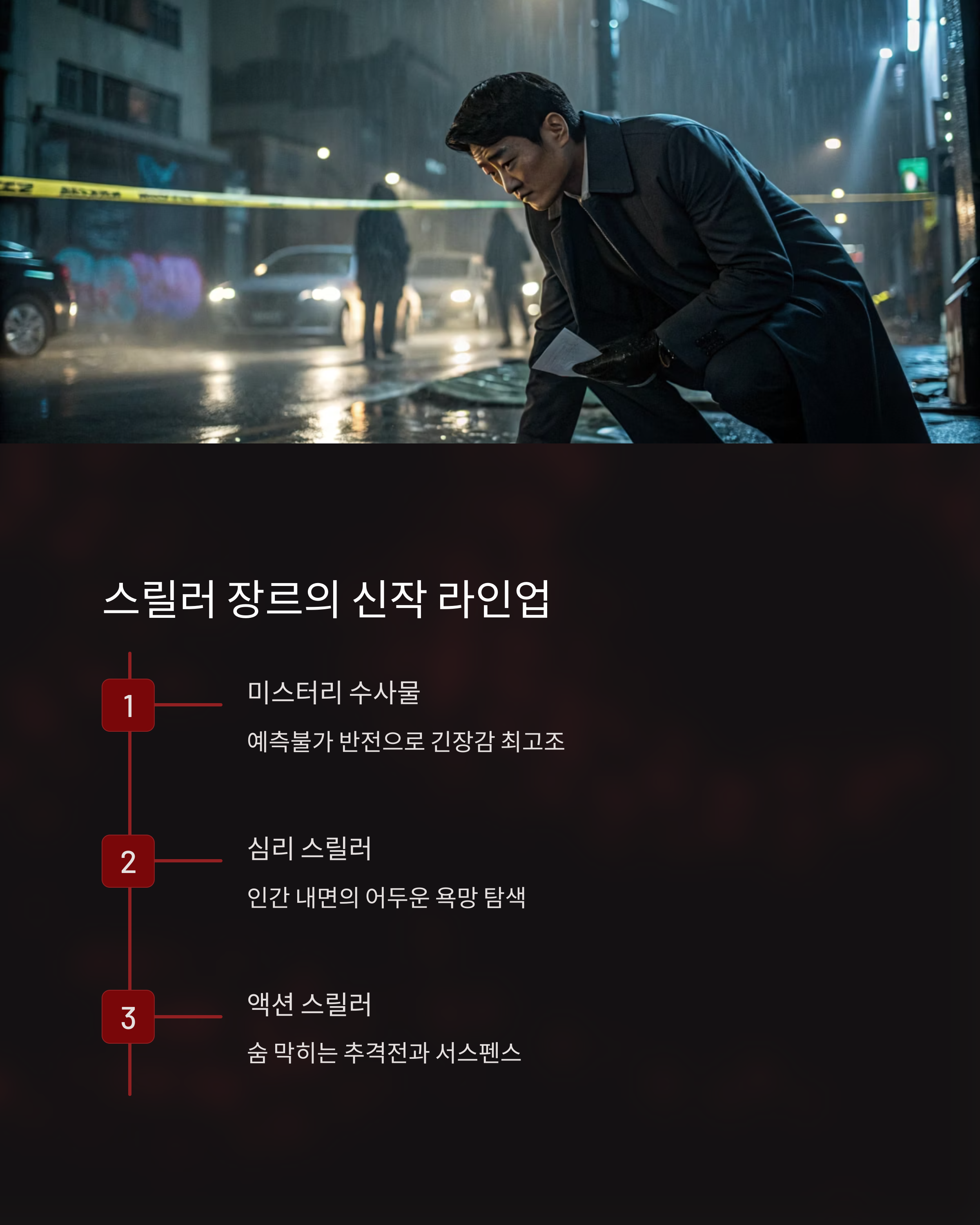 | 복수 스릴러 | 정의, 과거 트라우마, 복수 | ‘킬링 로맨스’, ‘차가운 불꽃’ |