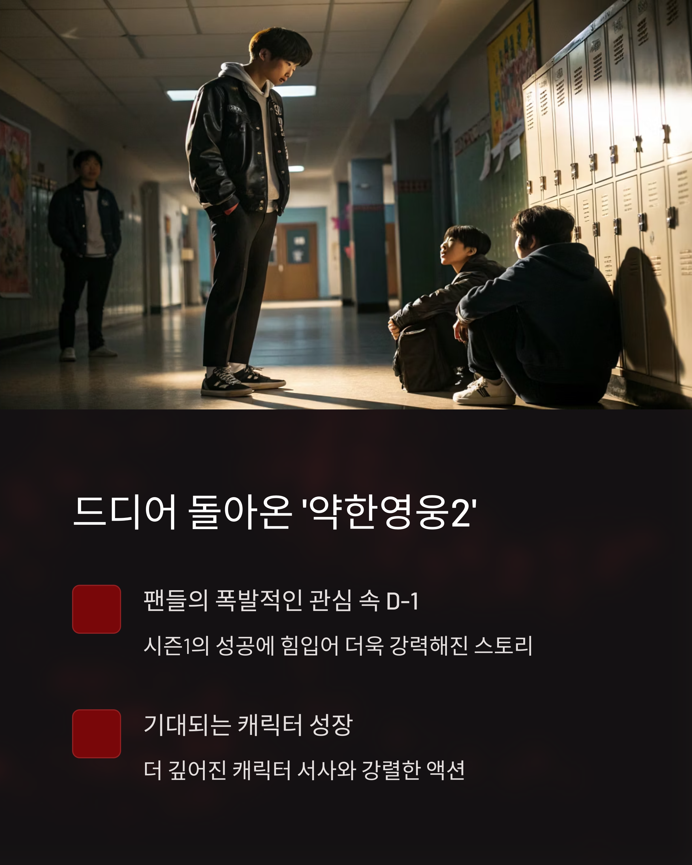 2022년 첫 시즌이 방영되자마자 입소문을 타며 10대~30대 남녀 시청률 1위를 기록했던 ‘약한영웅 Class 1’. 이후 시즌2 제작이 확정되면서 팬덤은 폭발적인 반응을 보였죠. 드디어 2025년 4월 26일, 넷플릭스 단독 공개를 앞두고 있습니다.
