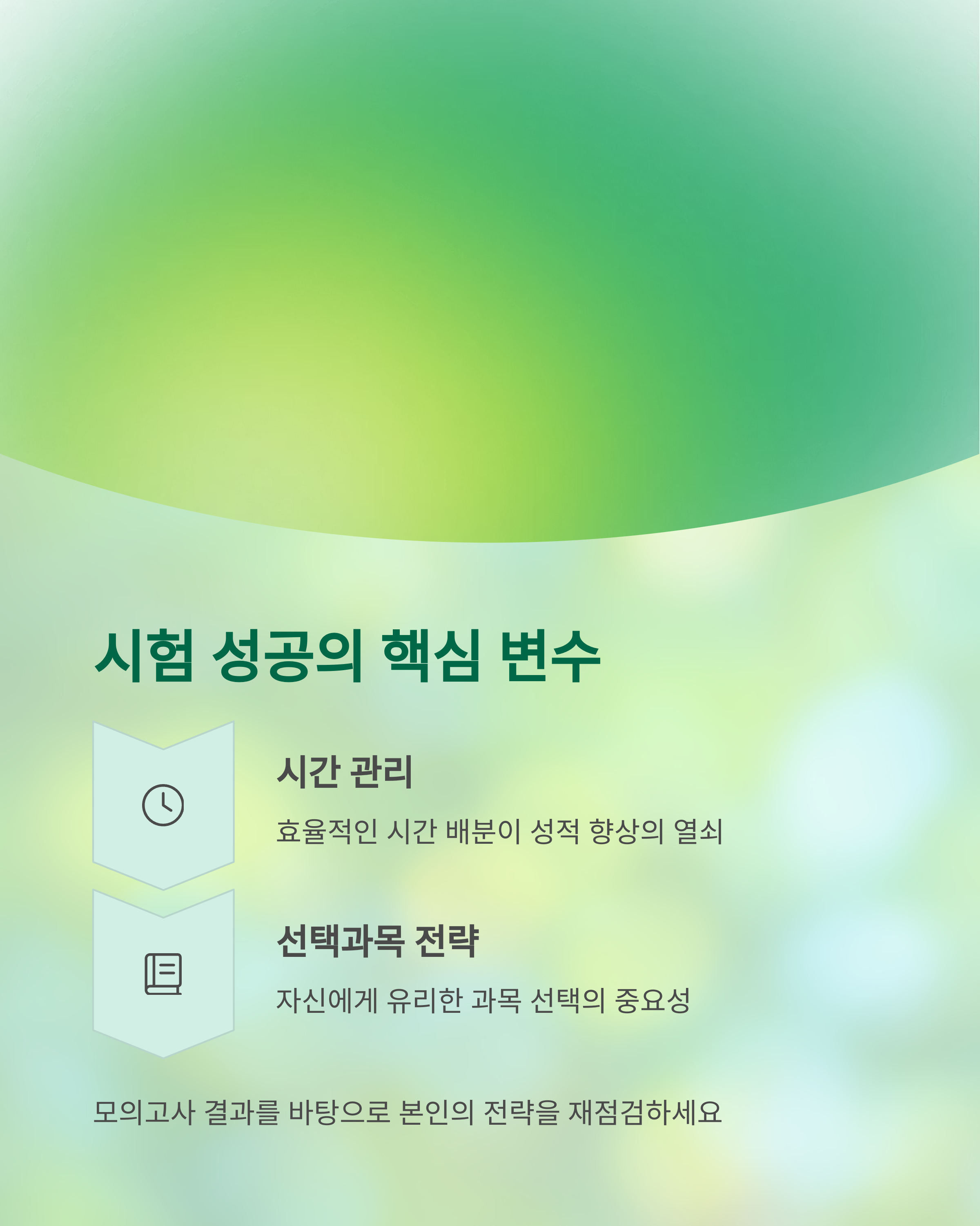 모의고사에서 가장 많은 수험생이 어려움을 겪는 건 시간 배분입니다. 특히 국어와 수학의 경우 1문제당 평균 1분 이내로 풀어야 안정적인 페이스 유지가 가능하죠.