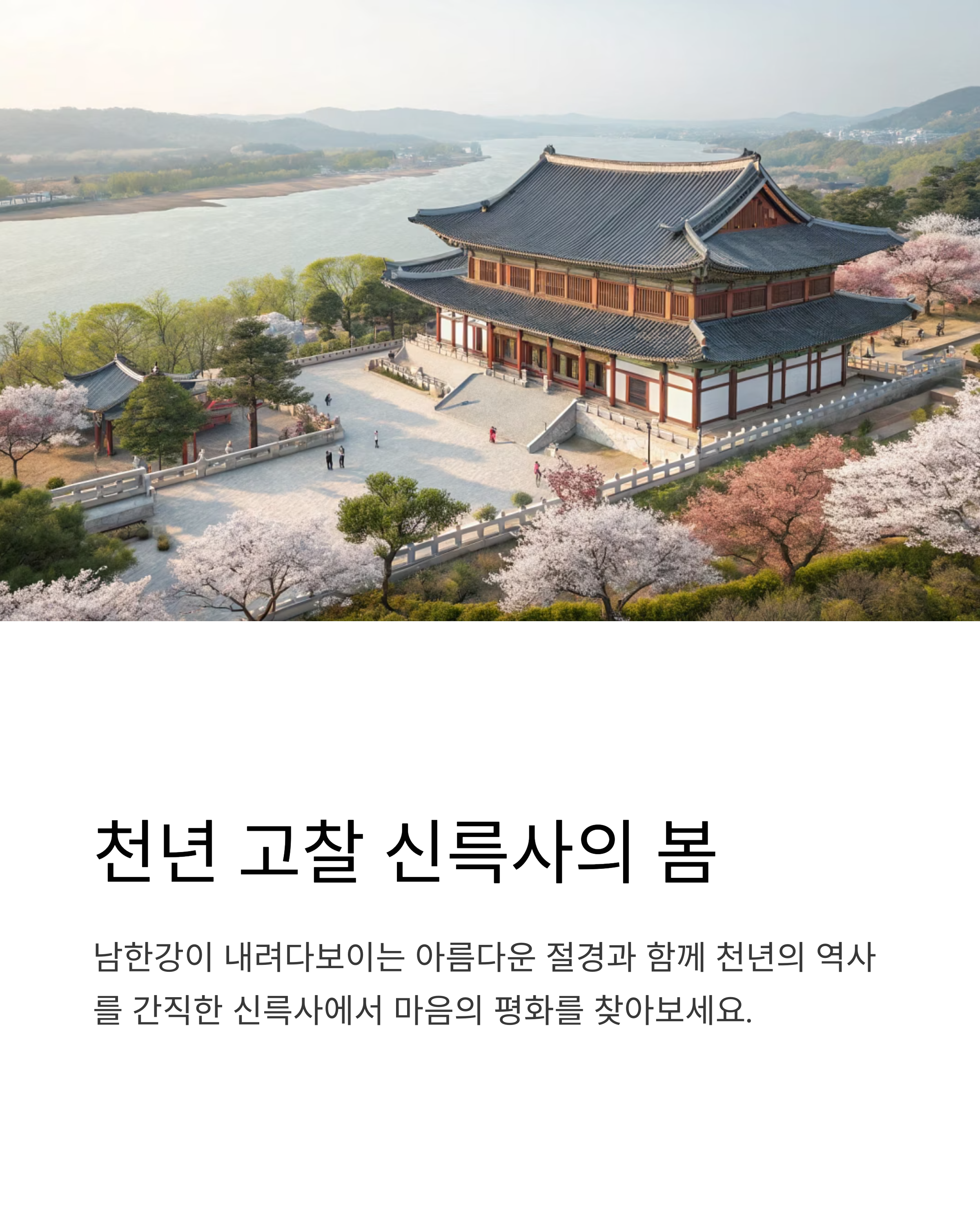 신륵사는 경기도 여주를 대표하는 사찰로, 남한강변의 풍경과 어우러진 아름다운 경관이 유명해요. 봄이면 연둣빛 신록이 강을 따라 펼쳐지고, 탑과 전각 사이로 흐르는 산책로는 조용한 사색의 시간을 선사합니다. 특히, 강 위에 설치된 부교는 사진 명소로도 인기 만점! 가족 여행, 커플 여행, 혼자만의 힐링 여행 어디든 잘 어울리는 곳입니다.