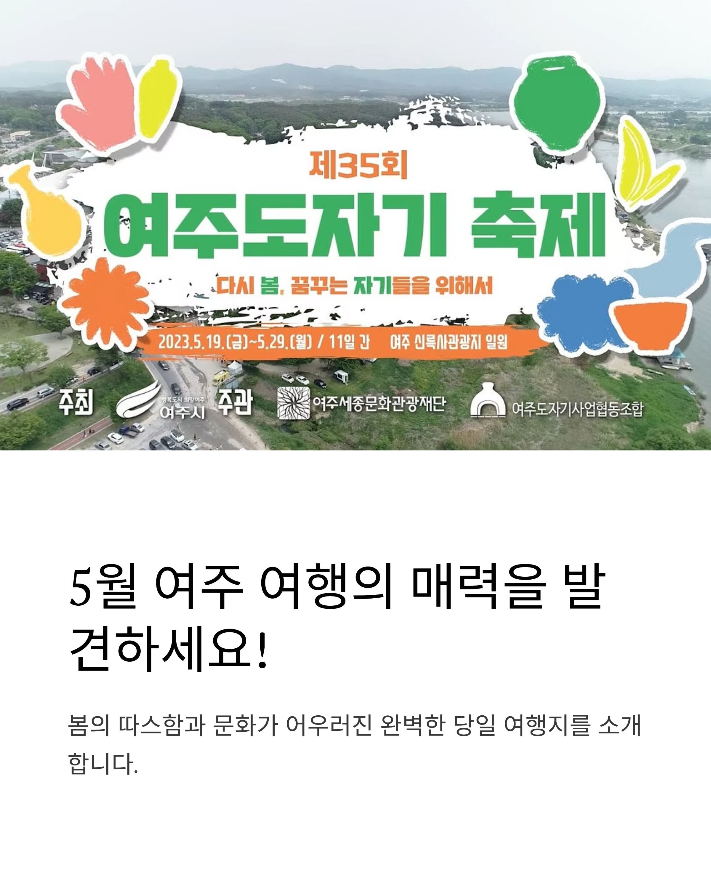 5월의 여주는 정말 모든 게 완벽한 여행지예요. 따뜻한 햇살, 싱그러운 자연, 그리고 문화와 전통이 어우러진 축제까지! 신륵사에서 마음의 평화를 얻고, 도자기축제에서 감성 충전하고, 여주 시내에서 맛집까지 즐기면 그야말로 힐링 풀코스 아닐까요? 짧게 다녀와도, 길게 머물러도 여운이 오래 남는 여행이 될 거예요.