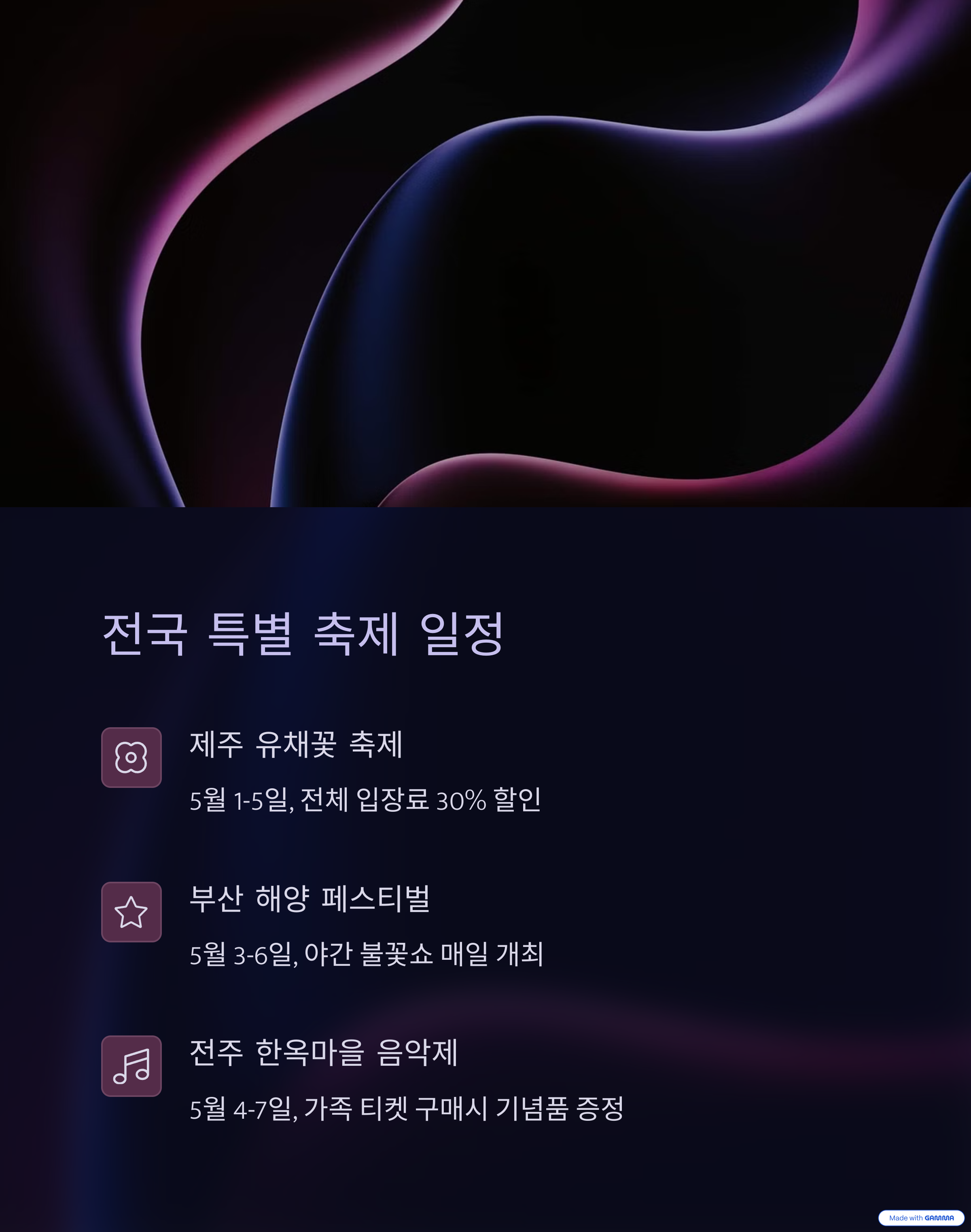 이제 곧 다가올 5월 황금연휴, 어디로 떠나야 할지 고민 중이셨다면 이 글이 도움이 되셨길 바라요. 사실 꼭 멀리 가지 않아도 좋아요. 우리 동네에도 충분히 특별한 여행지가 있다는 사실, 이제는 많은 분들이 알고 계시죠. 😊 다양한 지자체 축제와 혜택을 똑똑하게 활용해서 연휴를 더 풍성하게 보내보세요.