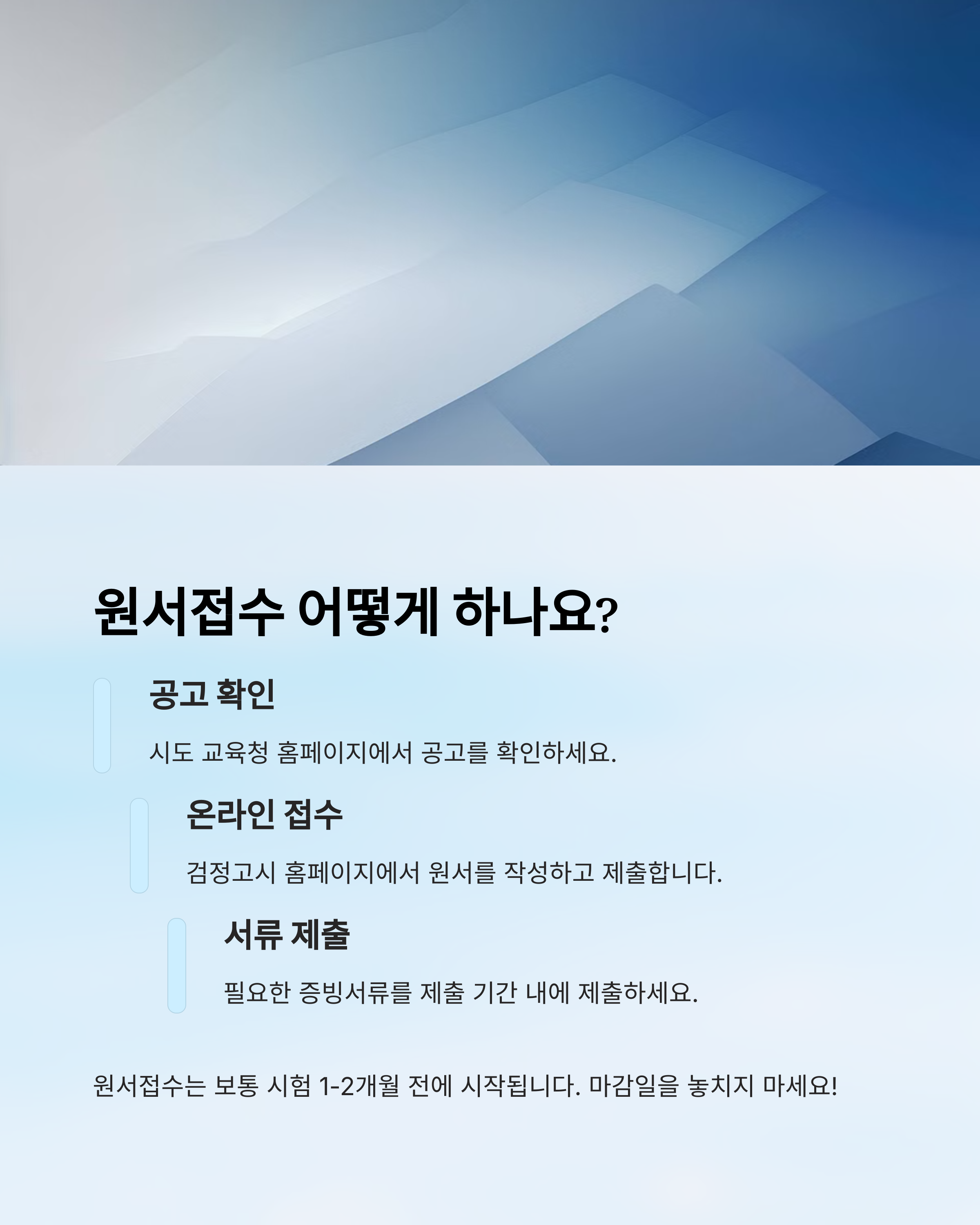검정고시 원서 접수는 온라인 접수 또는 방문 접수 두 가지 방법으로 가능해요. 최근엔 온라인으로 진행하는 경우가 많아서 컴퓨터와 프린터만 있다면 훨씬 간편하게 신청할 수 있어요.