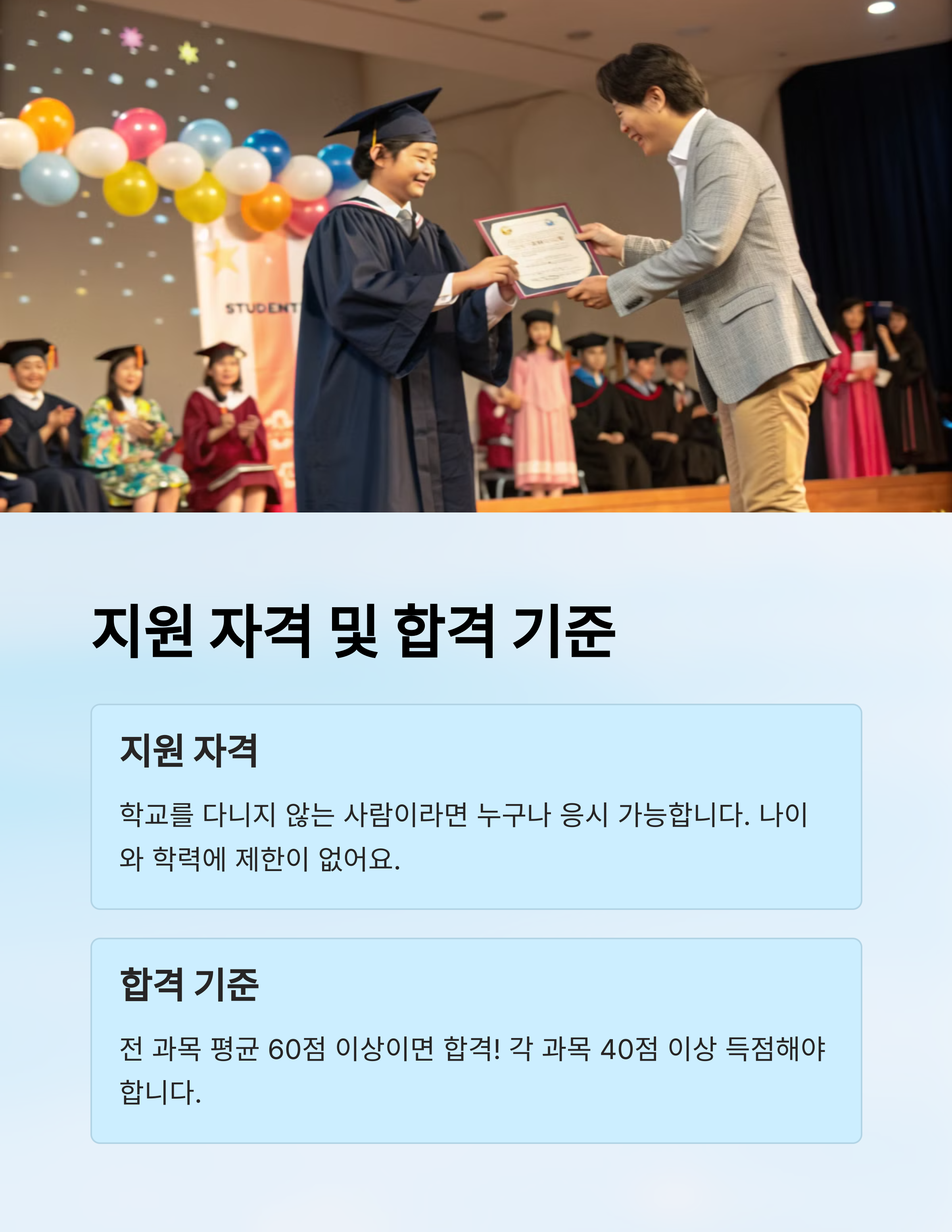 - 중등 검정고시: 초등학교 졸업 또는 동등학력 인정자