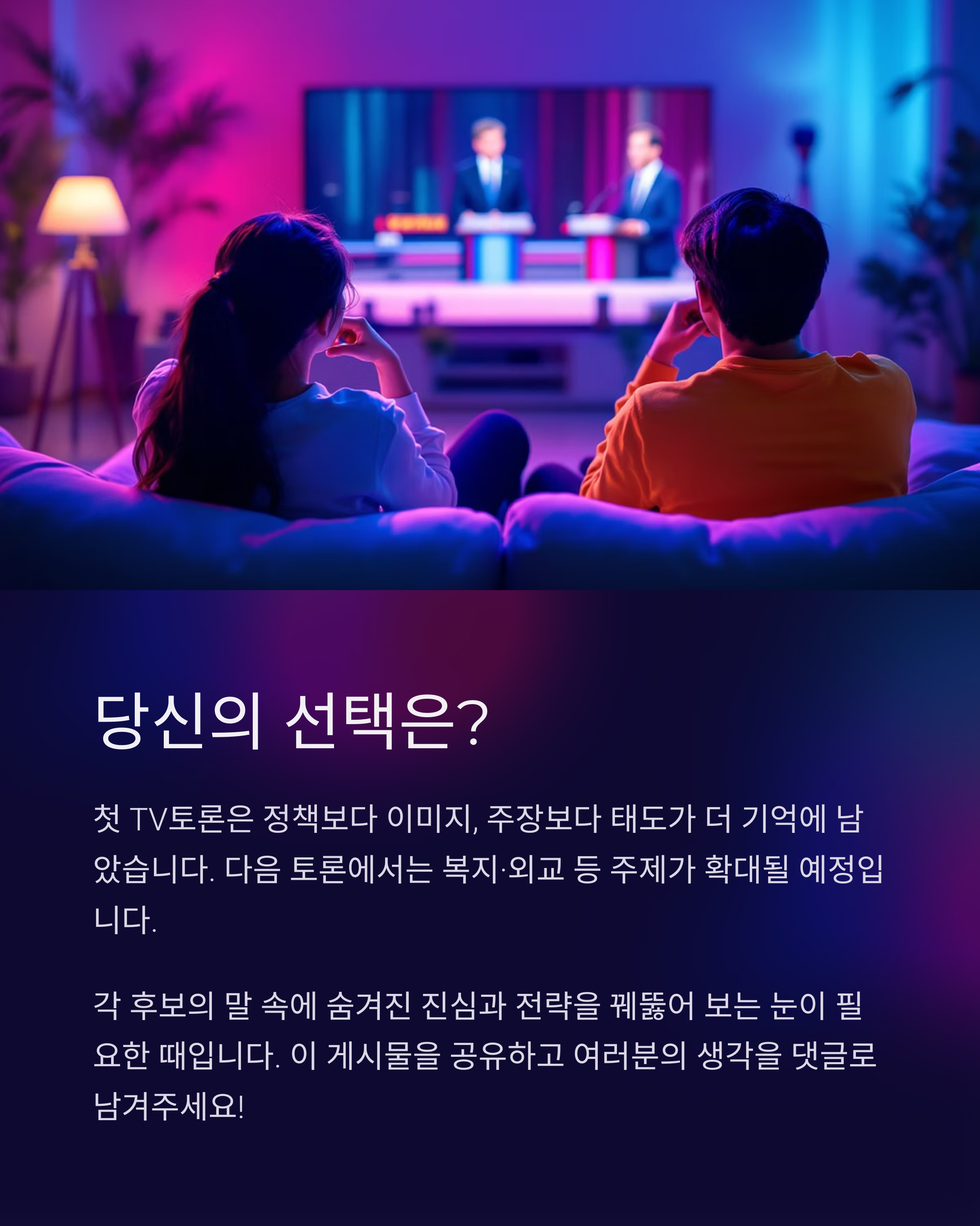 첫 TV토론은 정책보다 이미지, 주장보다 태도가 더 기억에 남는 순간들이 많았습니다. 하지만 그 와중에도 유권자들은 각 후보의 메시지를 나름대로 해석하며 다음 선택을 준비하고 있죠.