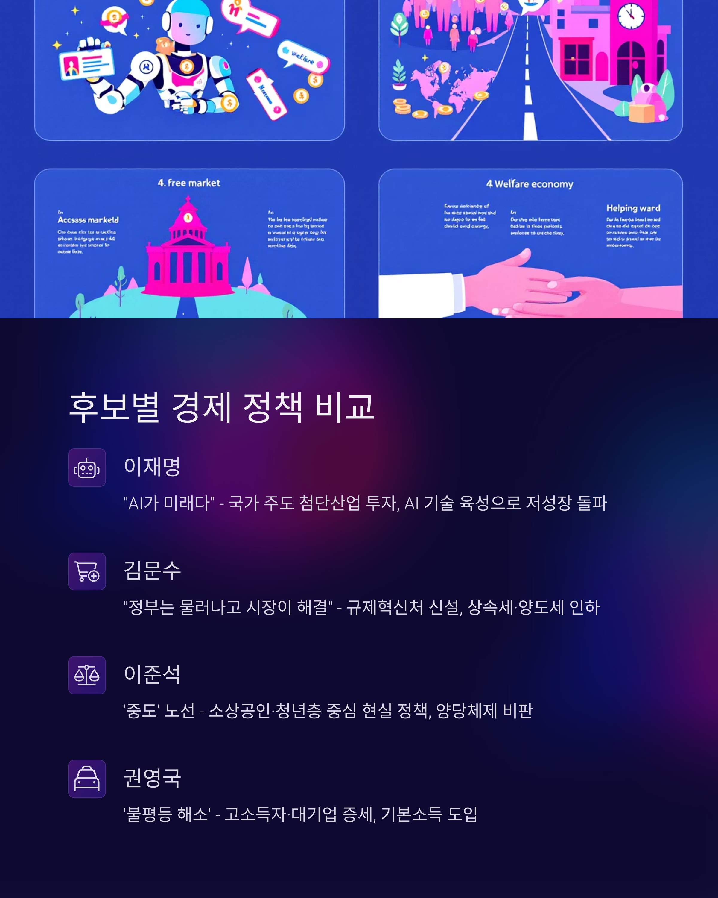 이재명 후보는 AI 산업 투자, 김문수는 규제 완화 중심의 자유시장경제, 이준석은 현실적인 중소기업 지원, 권영국은 고소득 증세를 통한 복지 확대를 주장했습니다.