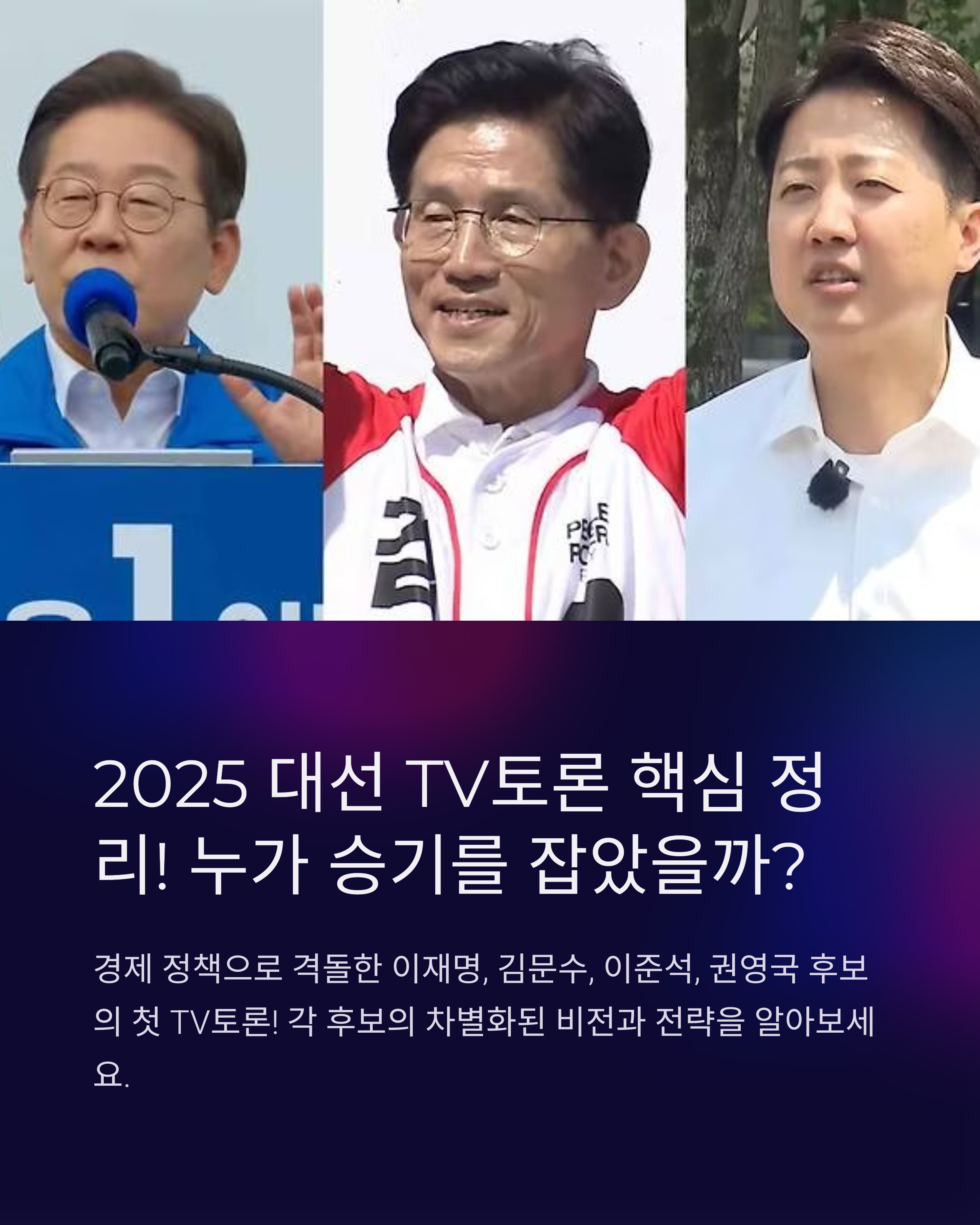 어제 TV토론을 보고 나서 저는 많은 생각이 들었습니다. 경제라는 큰 주제를 놓고 네 명의 후보가 보여준 서로 다른 해법, 그것은 단순한 공약 나열이 아니라 앞으로 대한민국이 어떤 방향으로 나아갈 것인지에 대한 선언 같았어요.