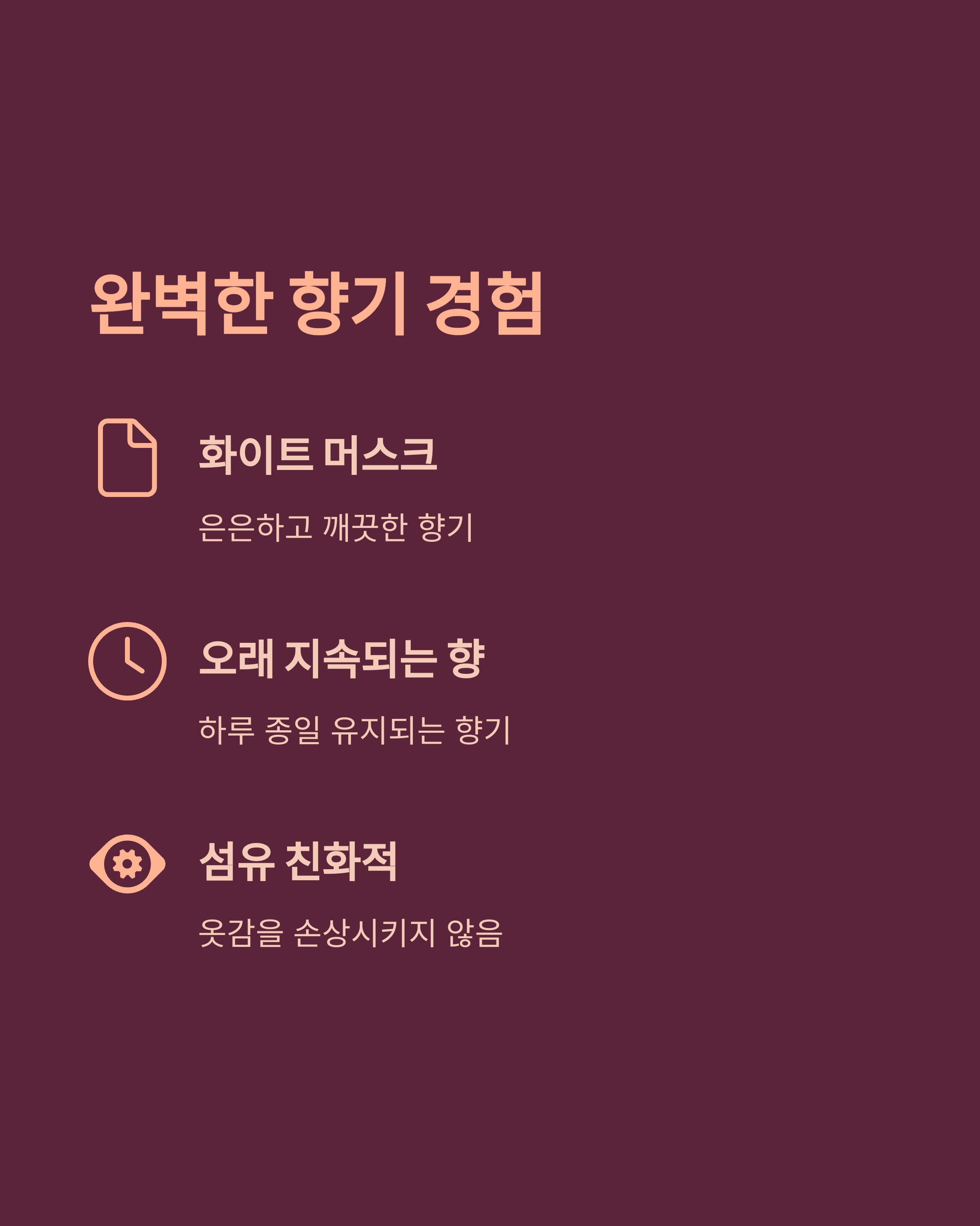 화이트 머스크 향을 메인으로, 부드럽고 포근한 느낌이 특징입니다. 사용자는 “아침에 뿌리고 저녁까지 은은하게 지속된다”는 후기를 많이 남기고 있으며, 인공적인 느낌이 적어 쾌적한 잔향을 선호하는 분들에게 매우 적합합니다.