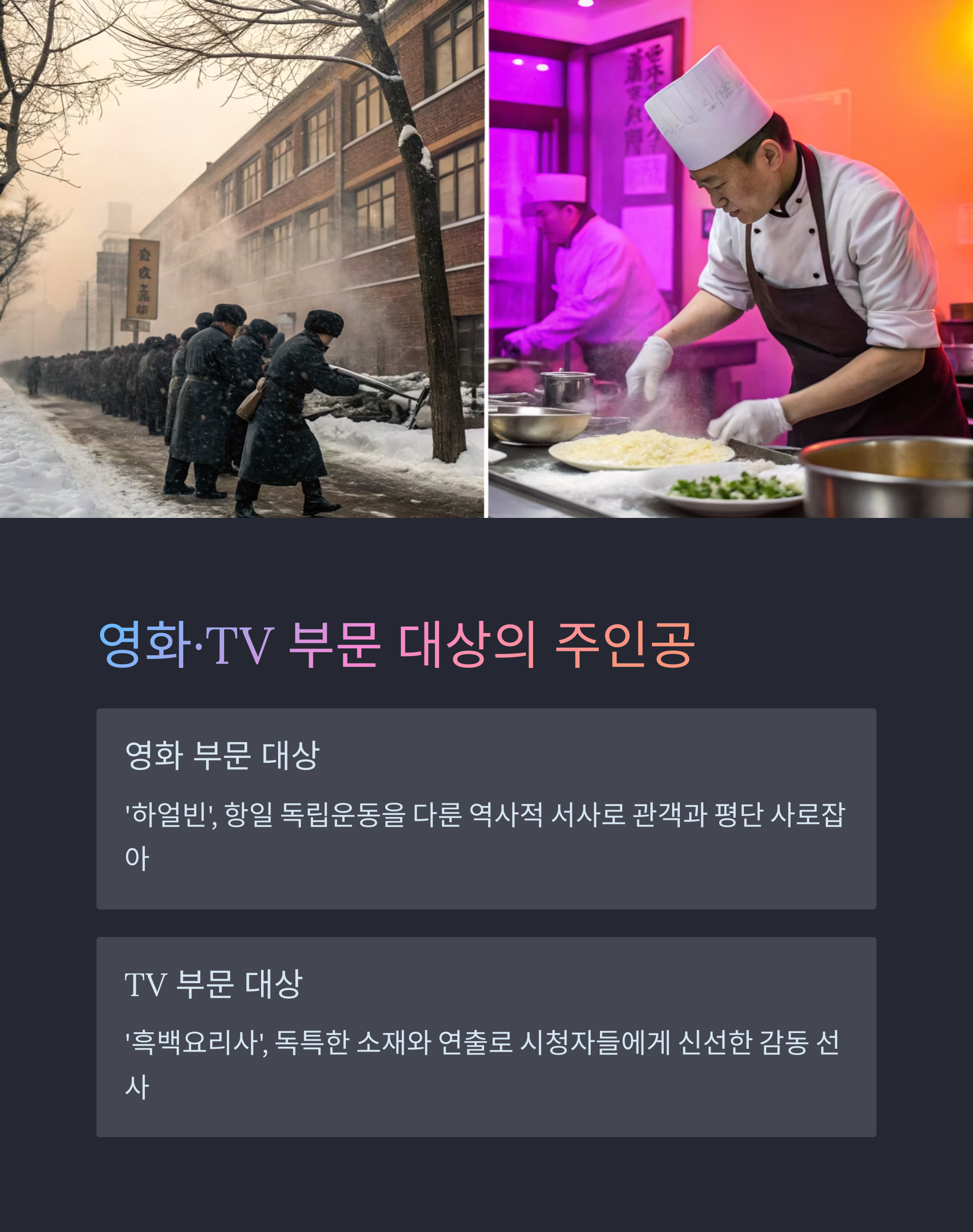 A. 영화 부문은 홍경표 촬영감독의 '하얼빈', 방송 부문은 예능 '흑백요리사'가 각각 대상을 수상했습니다.