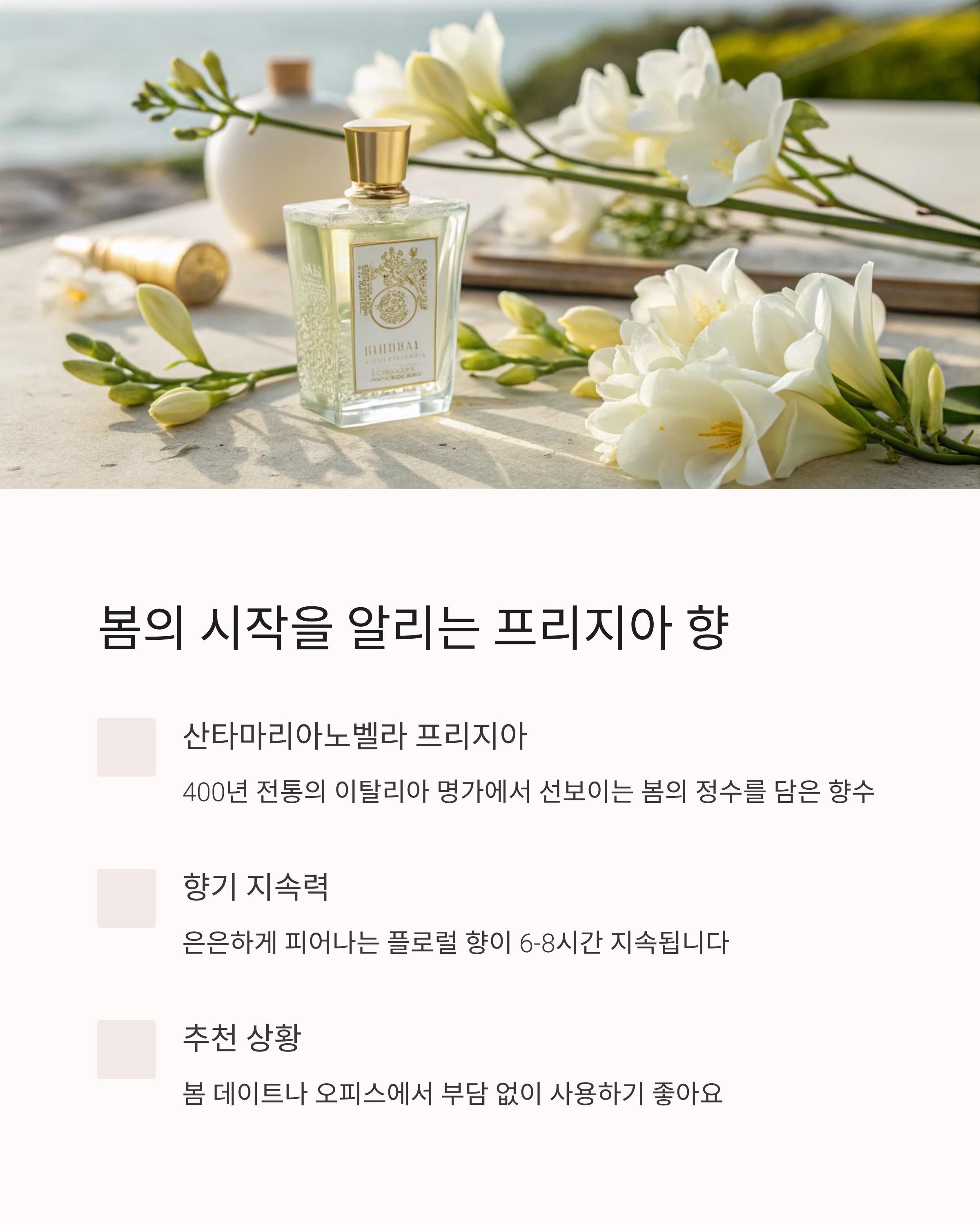 - “산타마리아노벨라는 유럽 느낌의 깊은 향이 매력이에요. 꼭 봄에 어울려요.”