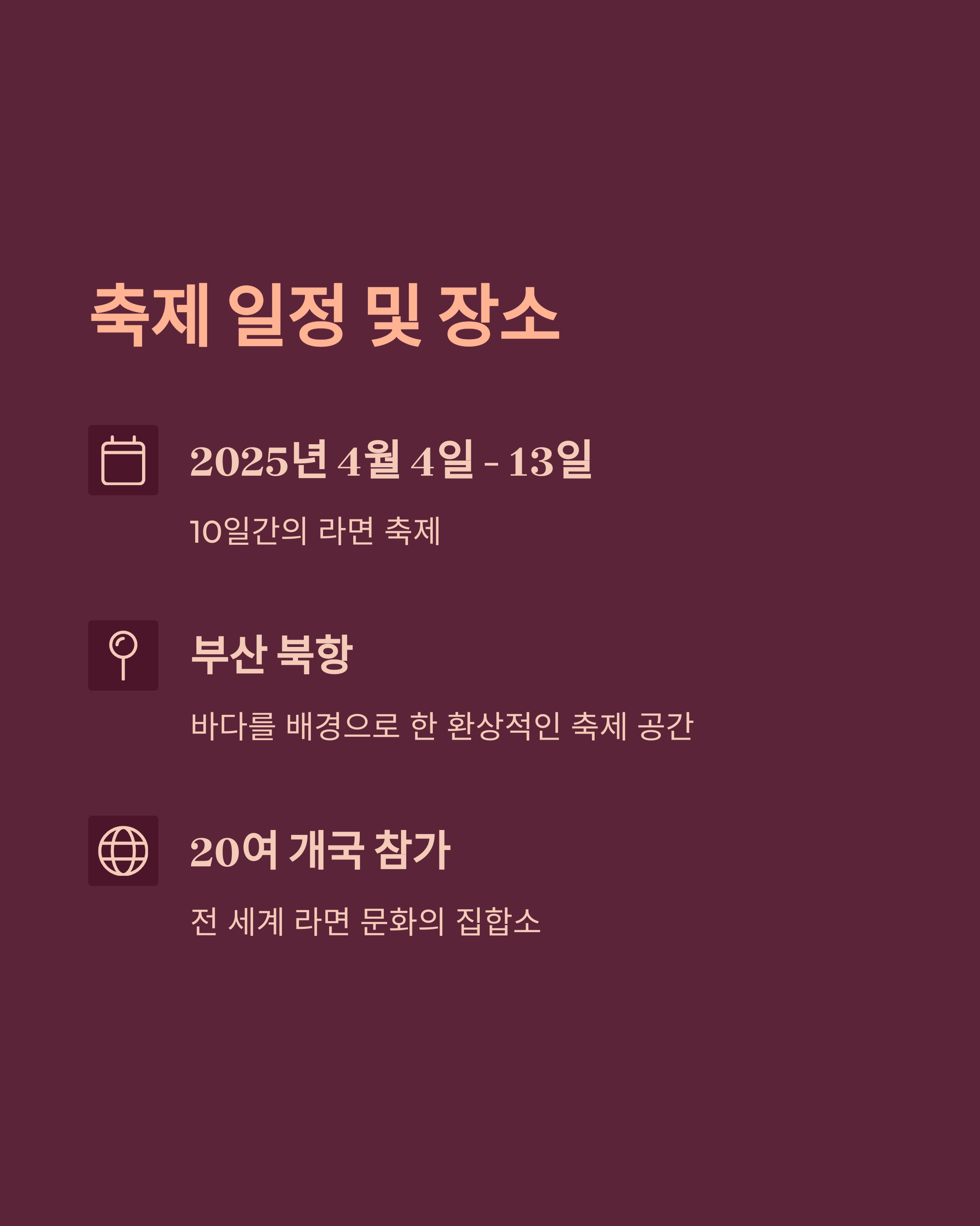 2025년 4월 4일부터 13일까지 열흘간 부산 북항 1부두 일대에서 열리는 세계라면축제는 국내외 20개국 이상의 라면 브랜드가 참여하는 글로벌 미식 축제입니다. 올해는 ‘라면으로 만나는 세계문화’라는 주제로 진행되며, 매일 다양한 국적의 셰프들이 직접 만든 라면을 시식할 수 있습니다. 특히 올해는 2억 원 상금이 걸린 '라면 파이터' 대회가 열려 많은 관심을 받고 있습니다.